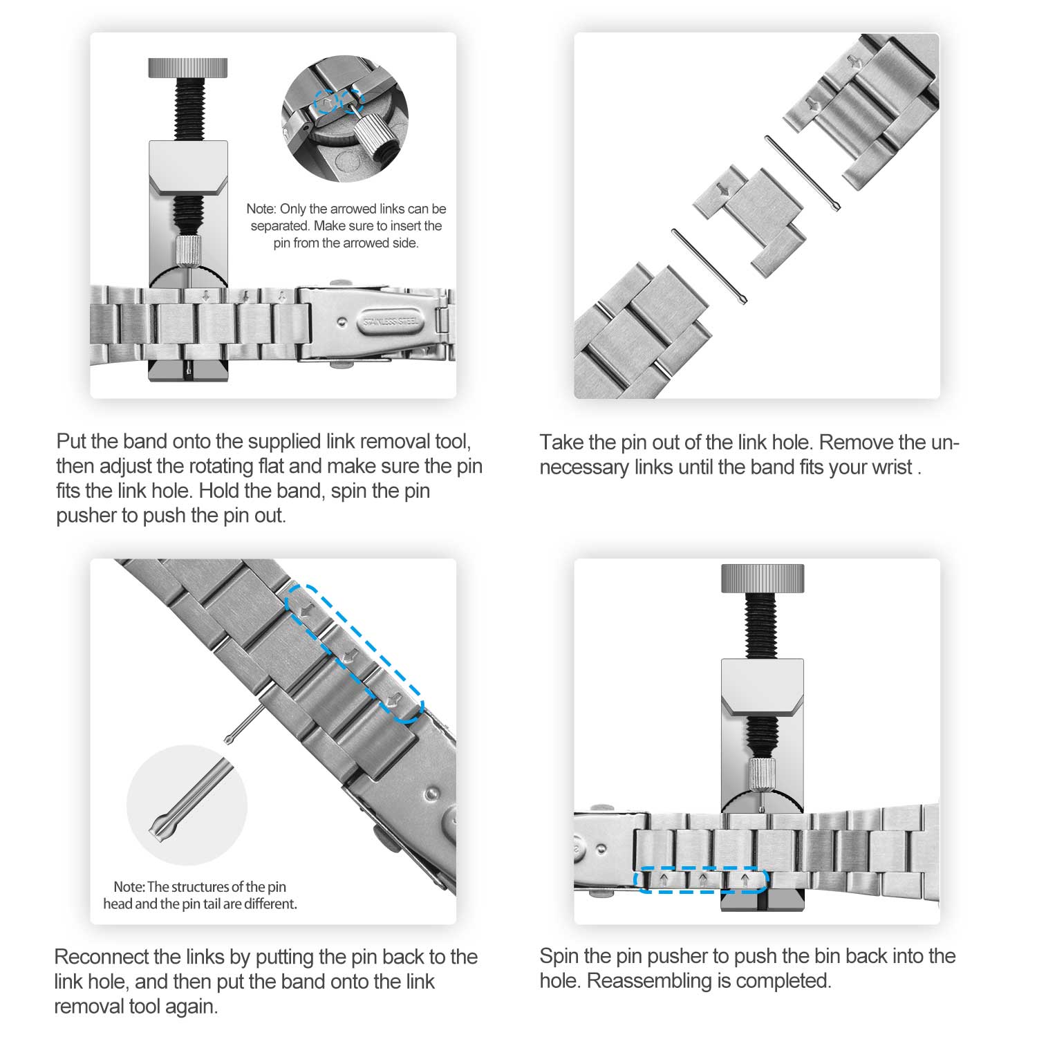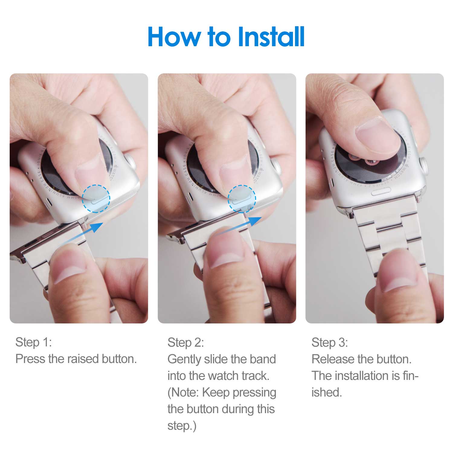 Package includes: 1Stainless Steel Apple Watch Band, 1Link Removal tool, 3*Pin Pusher Pins, Instruction manual, customer service card