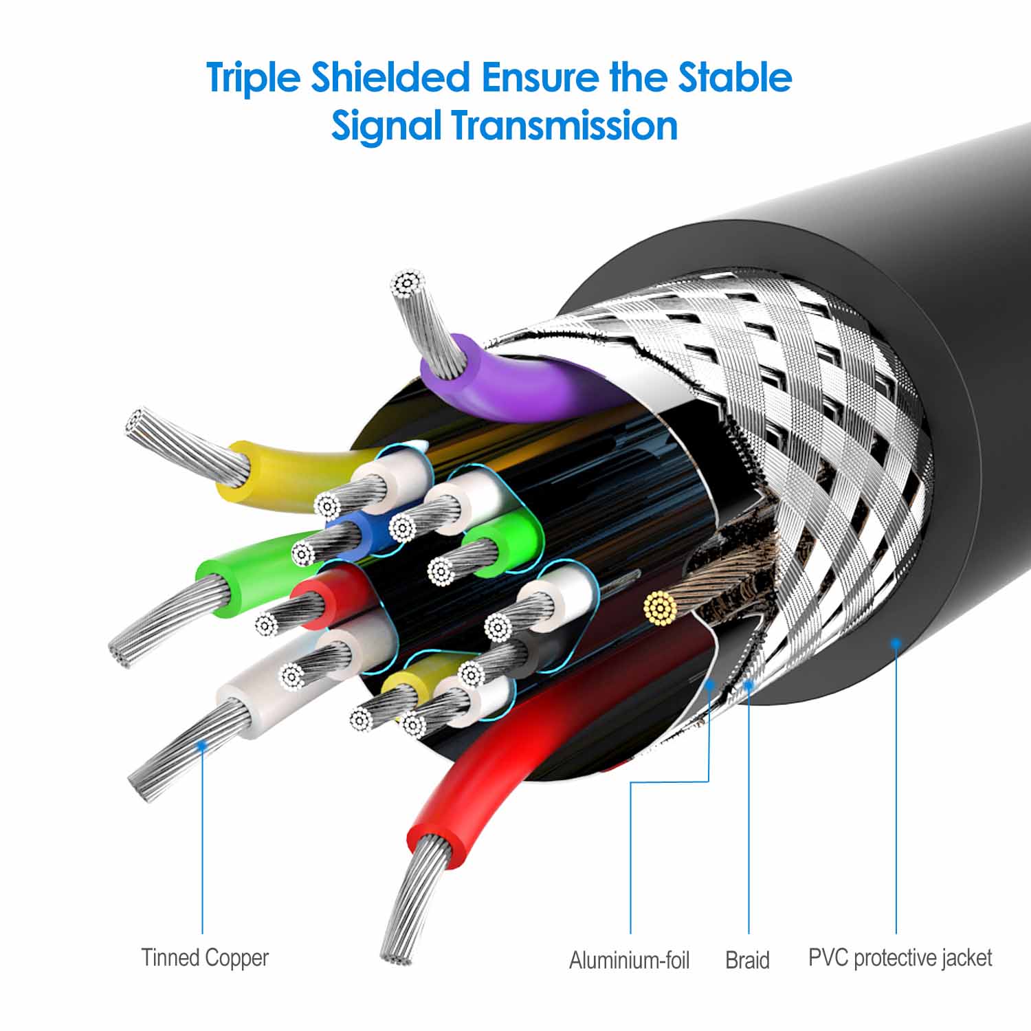 The gold-plated conductors resist corrosion and increase connectivity. The inner braided foil shielding reduces interference and improves signal quality