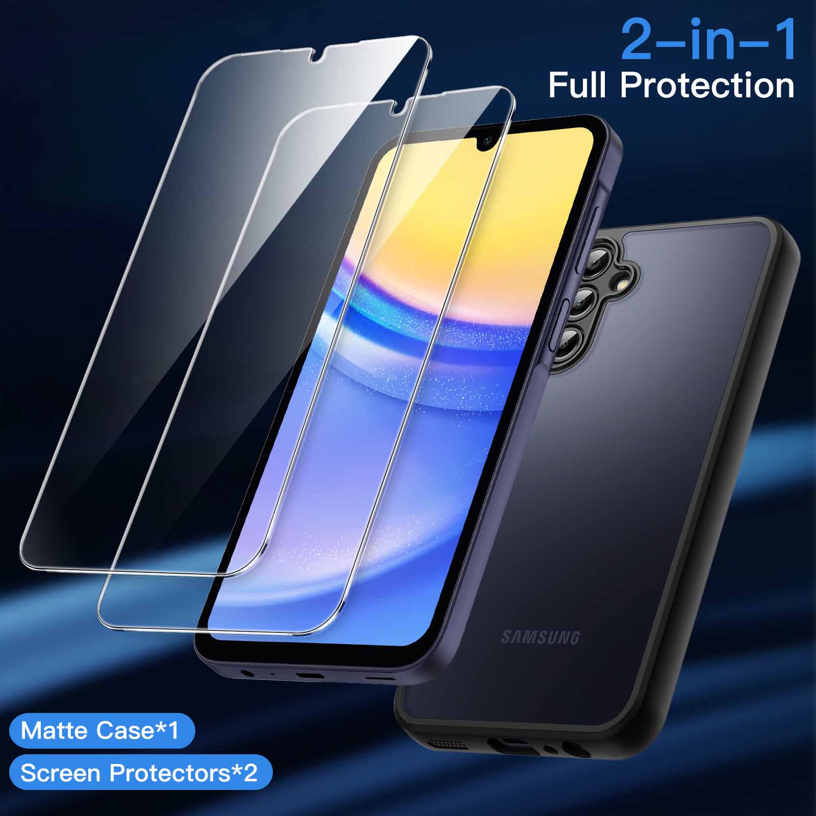 • [Dual Protection] Tailor-made for Samsung Galaxy A15 5G. You will receive a shockproof matte case and 2-pack tempered glass screen protectors, highly protecting your device against daily drops, bumps and scratches