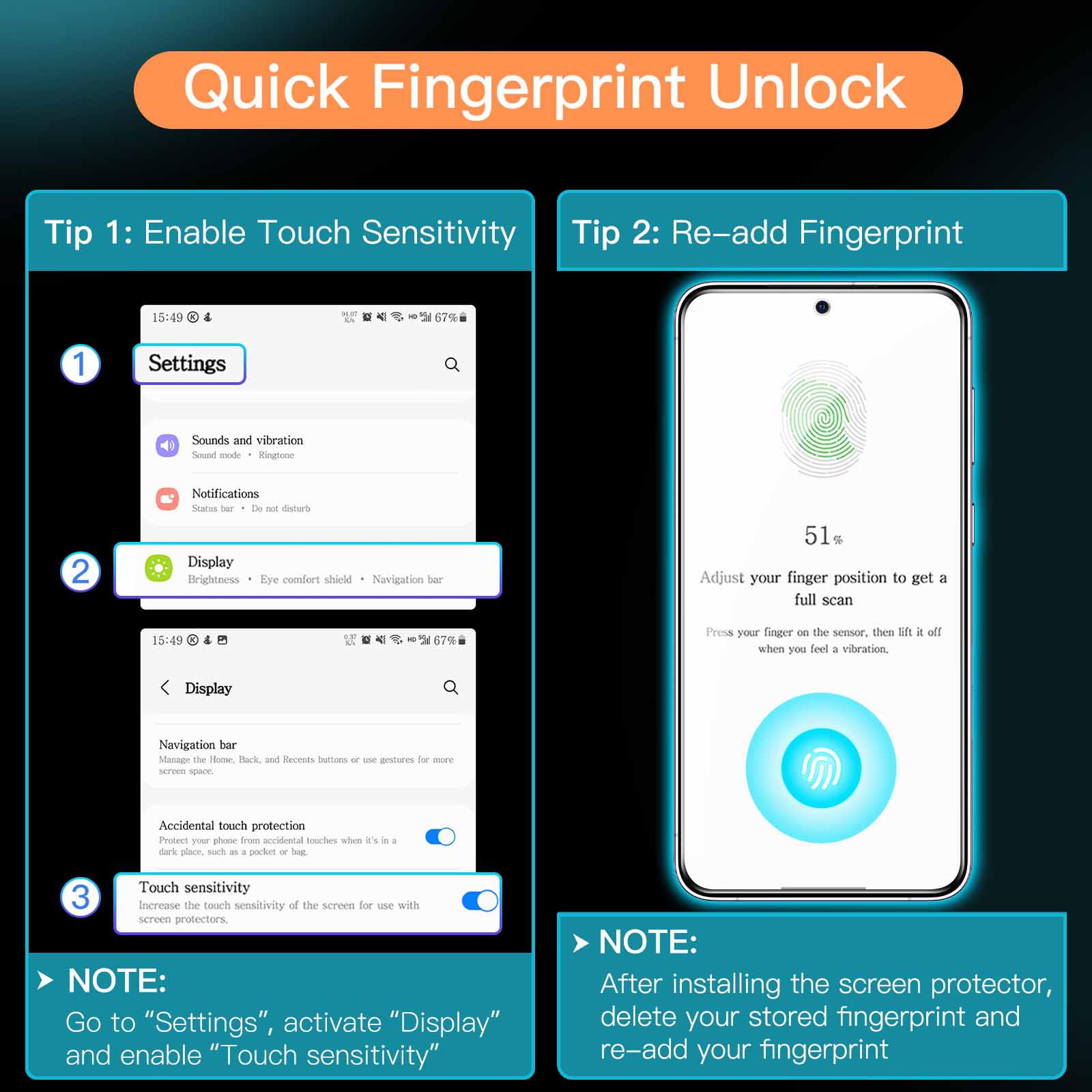 • [Attention] Please re-add fingerprint AFTER applying the film and go to Settings of your device to activate the Touch Sensitivity for a better unlock experience. Exclusively for Samsung Galaxy S23 / S23 Plus 5G 6.6-Inch