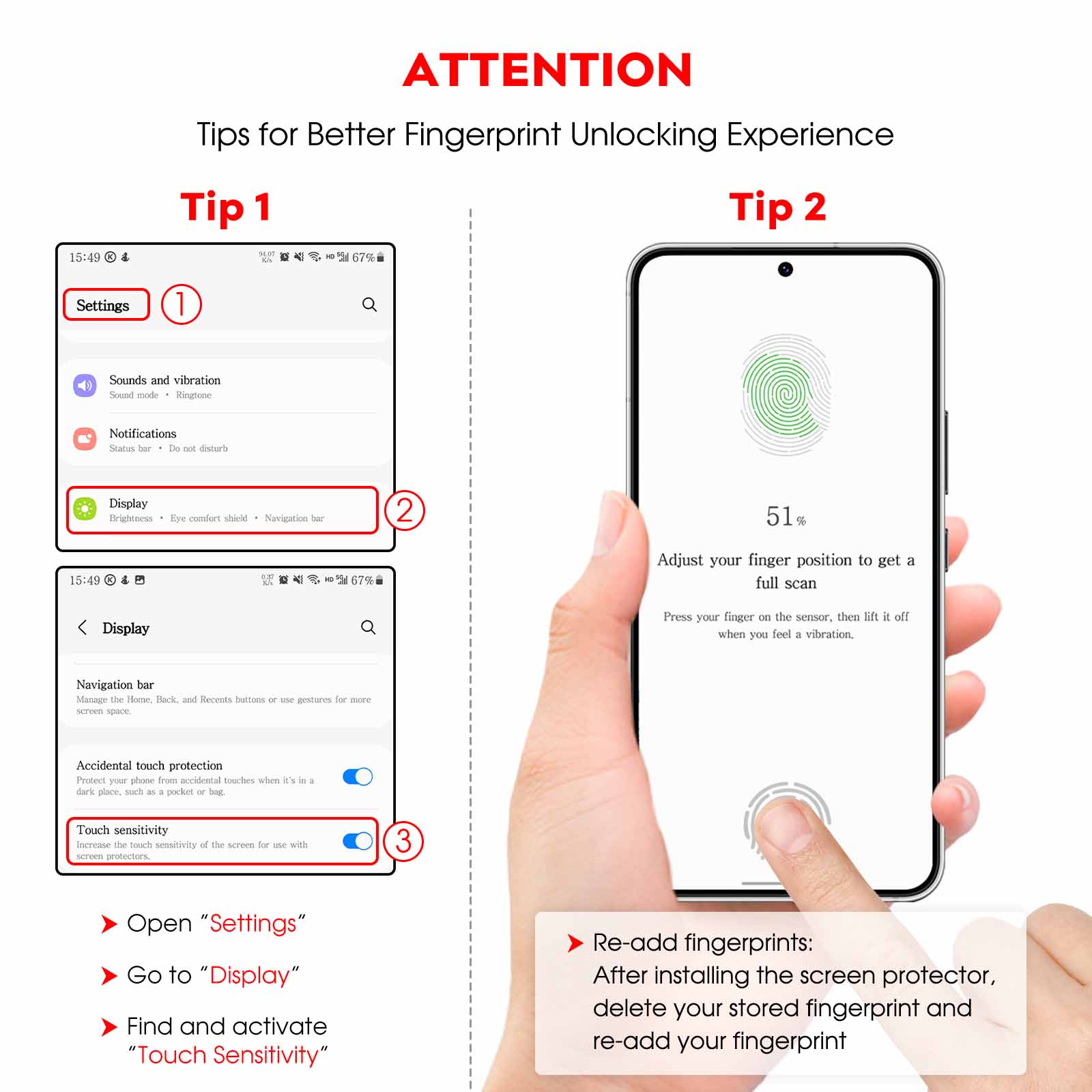 • [Fingerprint Unlocked] Designed for Samsung Galaxy S22 /S22 Plus 6.6-Inch. For a better unlocking experience, please go to Settings of your device to activate the Touch Sensitivity and re-enter your fingerprint after applying the film