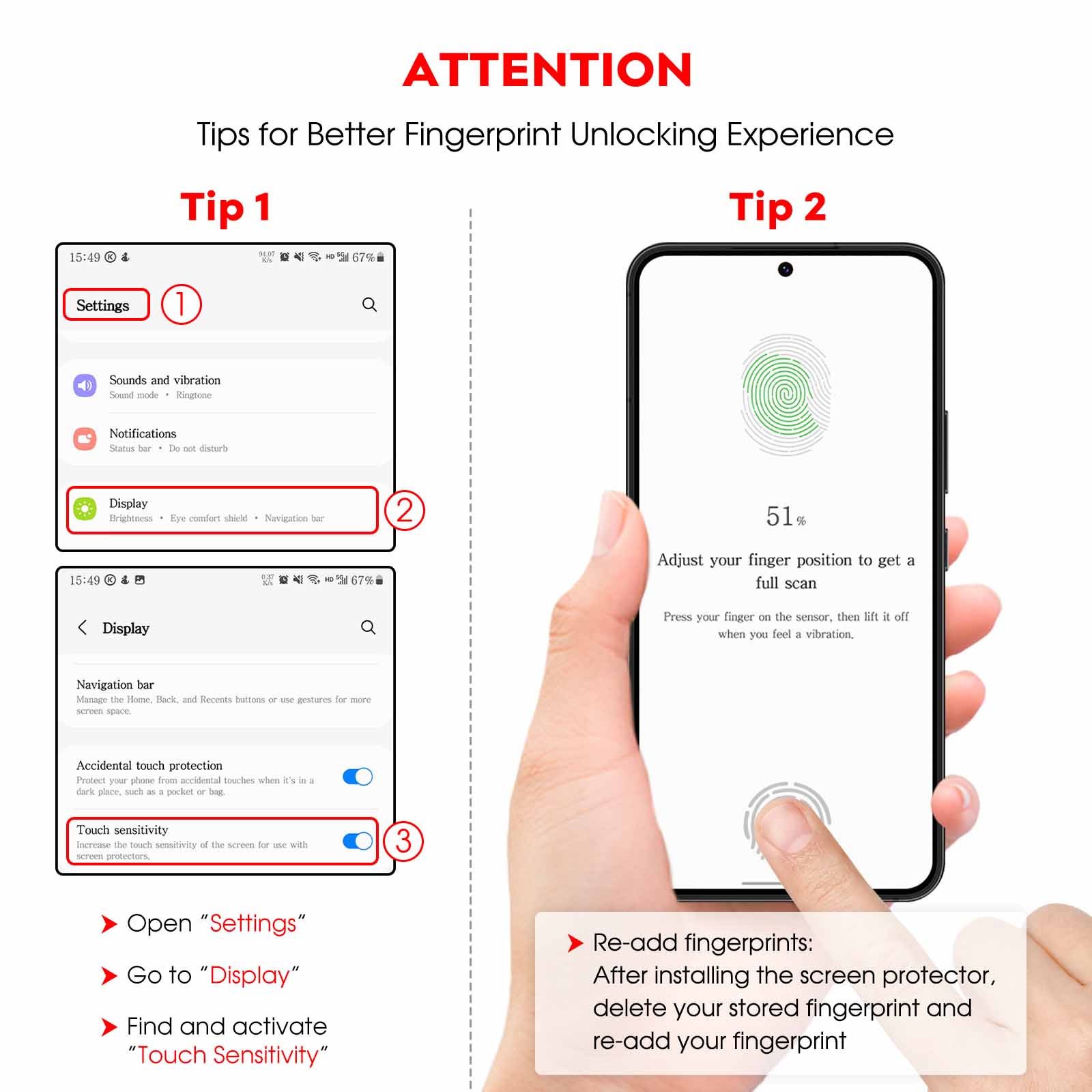 [Fingerprint Unlocked] Designed for Samsung Galaxy S22 6.1-Inch. For a better unlocking experience, please go to Settings of your device to activate the Touch Sensitivity and re-enter your fingerprint after applying the film
