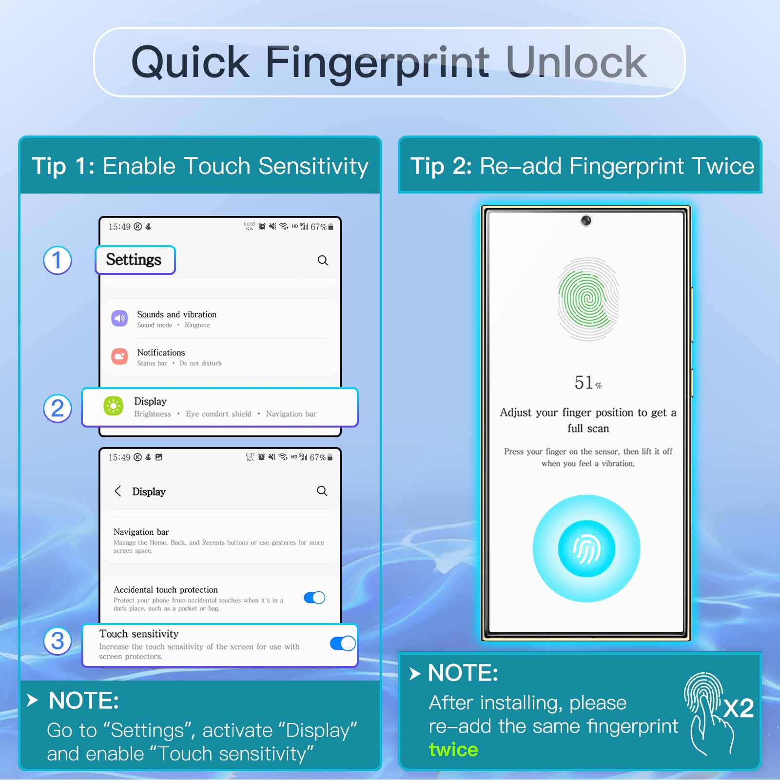 [Warm Tips] Please re-add fingerprint AFTER applying the film and go to Settings of your device to activate the Touch Sensitivity for a better unlock experience. Exclusively for Samsung Galaxy S24 Ultra 5G 6.8-inch