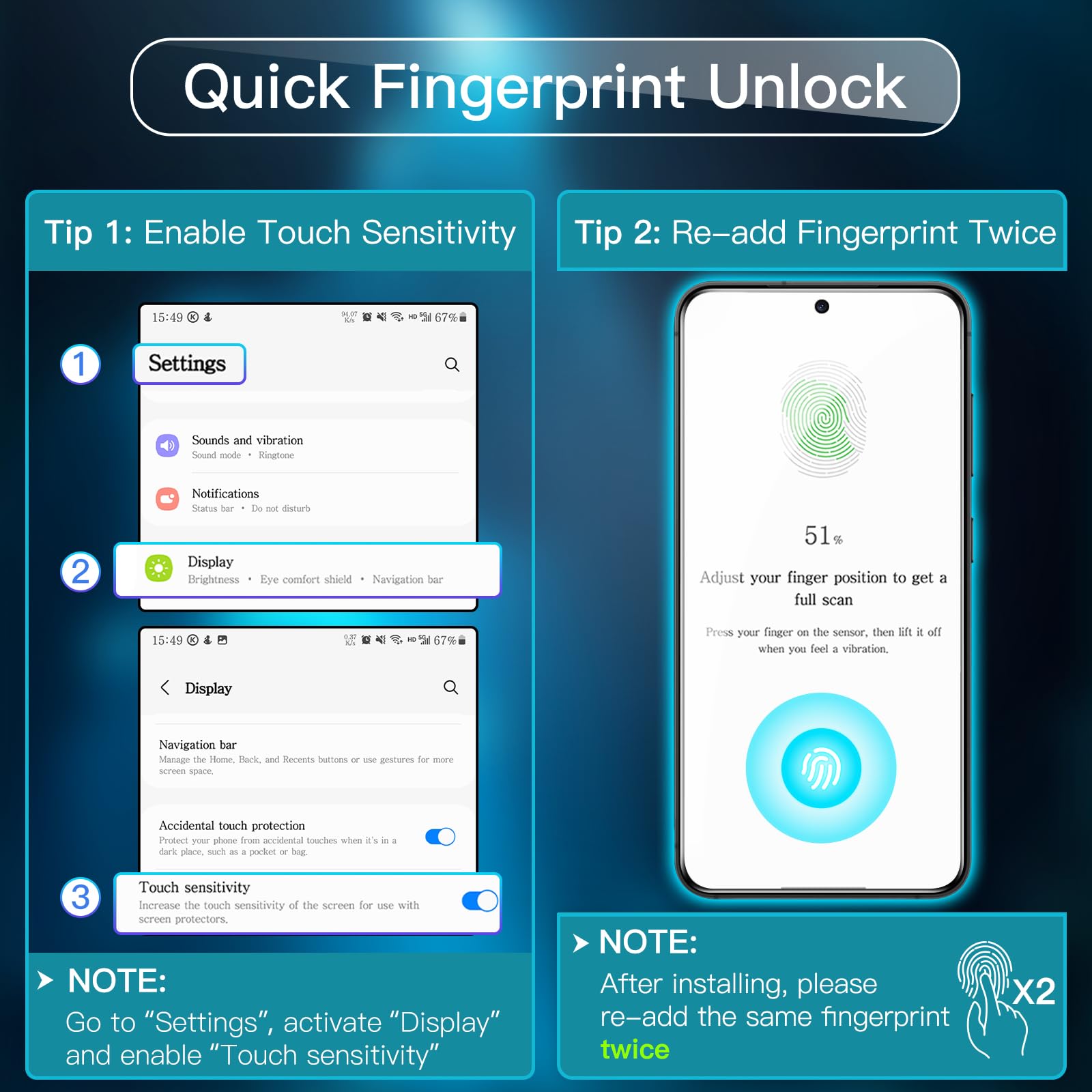 [Premium Tempered Glass] Both screen protector and camera lens protector are built with 9H hardness anti-scratch material. Highly responsive and HD clear (NOTE: For better fingerprint unlock, go to device??s Settings to activate the Touch sensitivity and re-add your fingerprint after installing the film)
