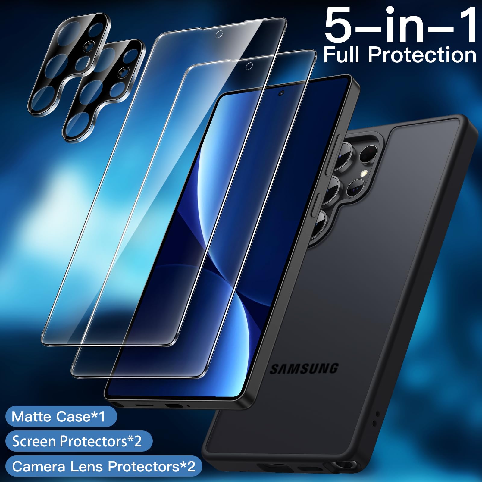 • [Compatibility] Exclusively designed for Samsung Galaxy S25 Ultra 5G. NOTE: Not for Samsung Galaxy S25 / S25 Plus. This protective matte case, together with 2 pack screen protectors and 2 pack camera lens protectors, provides a 360 degree all-around protection for your phone