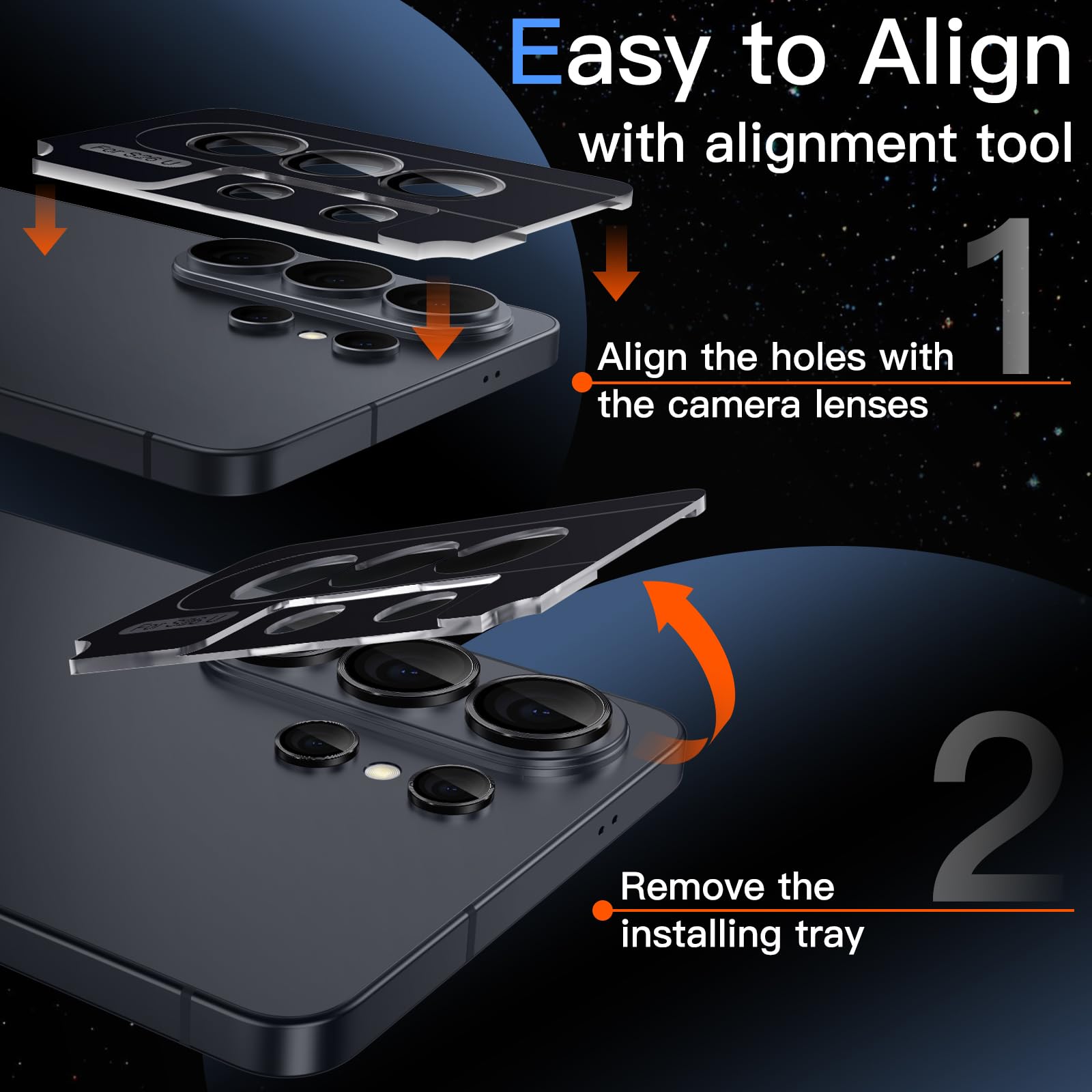 [Easy Installation] The lens protectors are preset in an easy installation tray. Simply peel off the plastic plate, align and firmly press down the lens protectors to the camera lenses, and then remove the tray