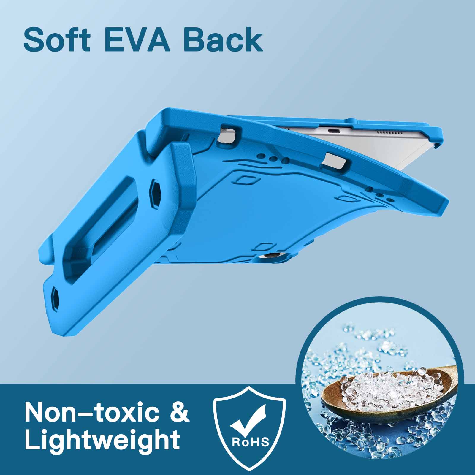 [Versatile Stand] Designed with a kid-friendly handle with anti-slip texture. It is easy for kids to carry around and fold it back to convert into a sturdy stand for hands-free viewing and comfortable typing