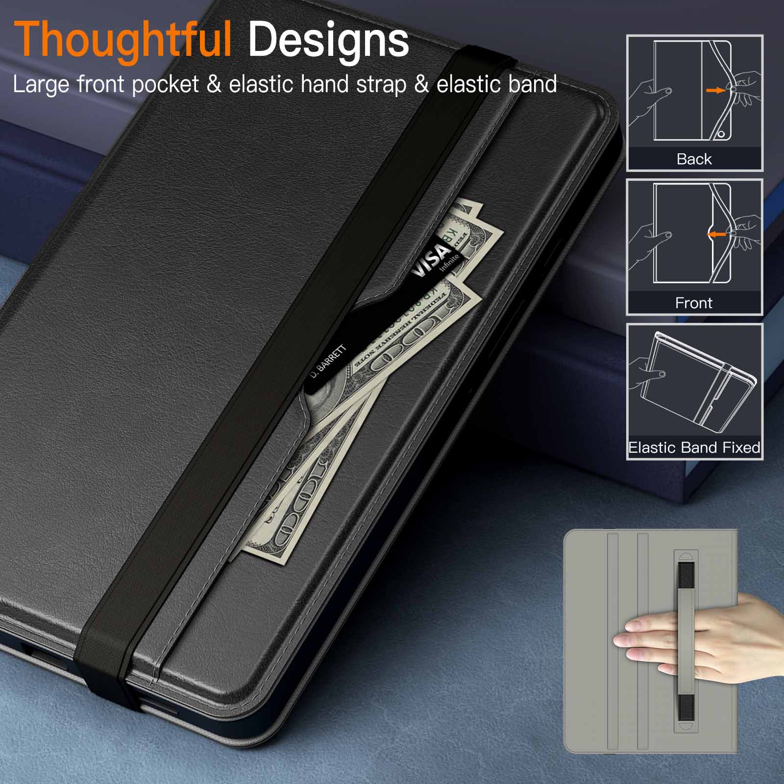 [Multi-Functional] A large front pocket to store cards, cash, notes and so on. Also come with an exterior elastic strap to fix your tablet tightly to the case, and the adjustable inner hand strap enhances the grip of your device
