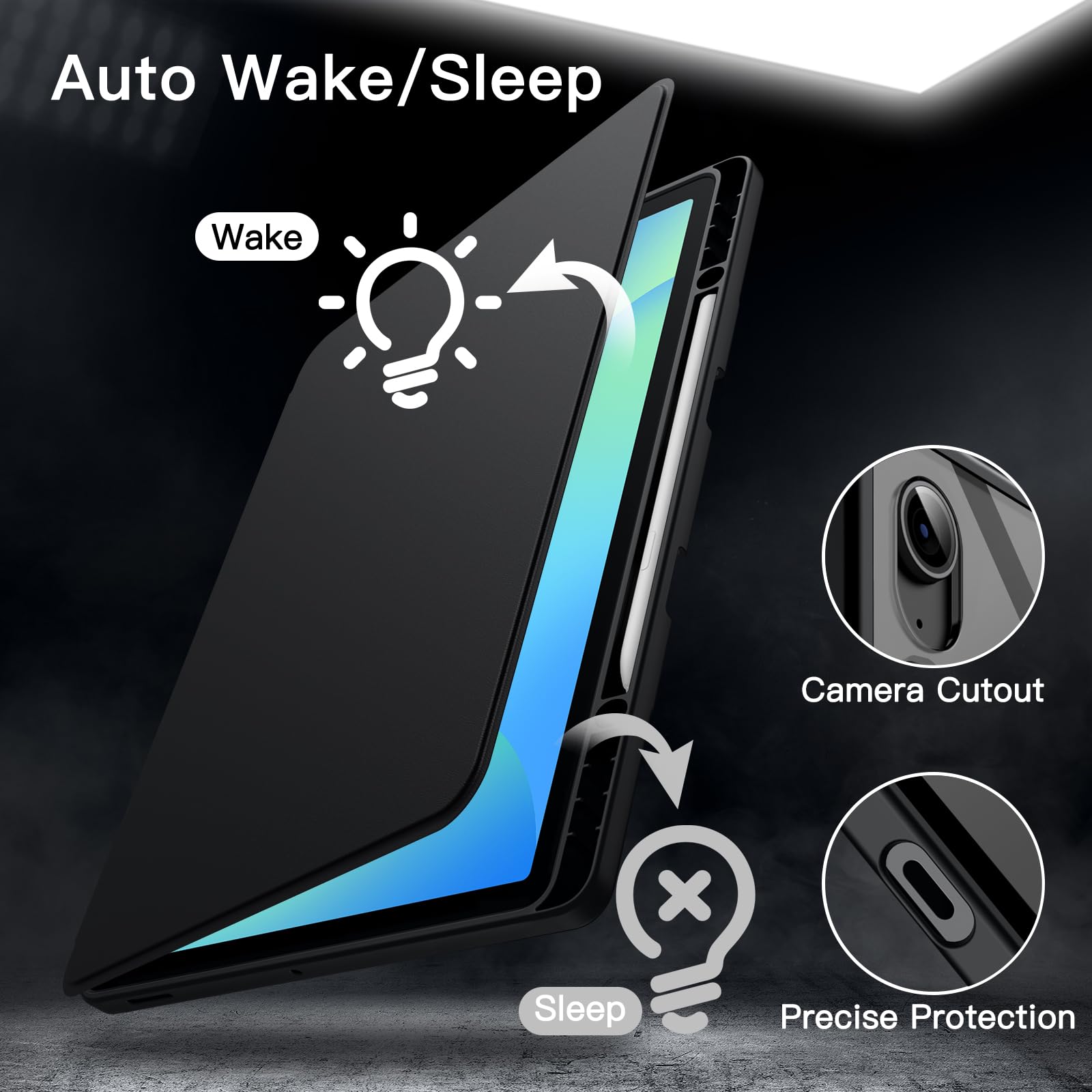 [Auto Wake/Sleep] Wake up the screen or bring it to a sleep mode by opening or closing the front cover. More energy-saving, and the built-in magnet keeps the case securely closed