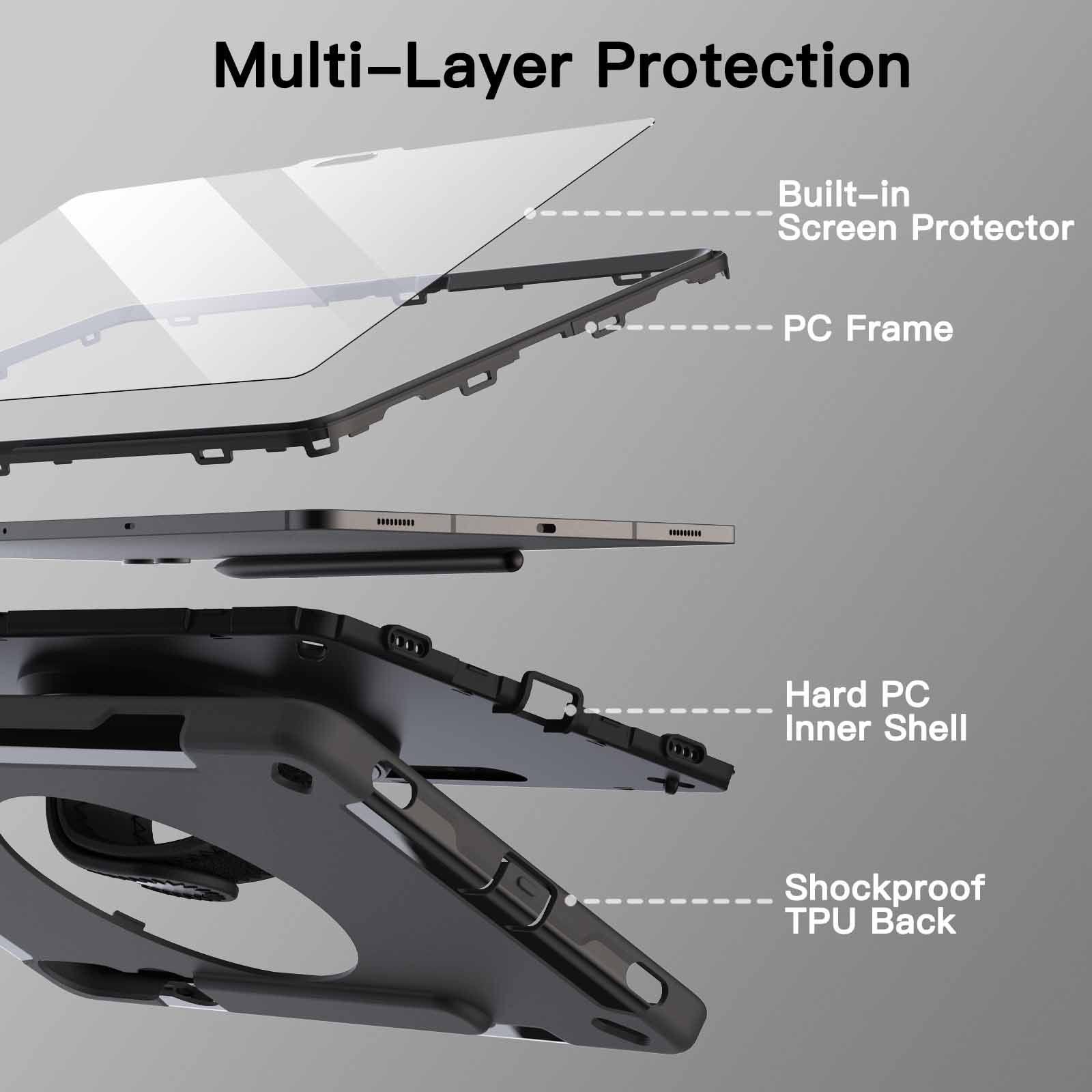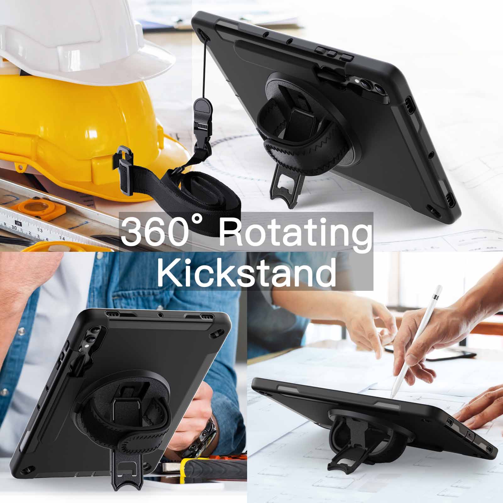 This shockproof protective case is really heavy duty. What I like about it is that I can hold it in one hand with the hand strap and it will not slip or fall off with the rotation function on it. it comes with a shoulder strap. and has a special protective pocket for the stylus pen. I’m glad that I got this product..I give this product 5 Stars.
