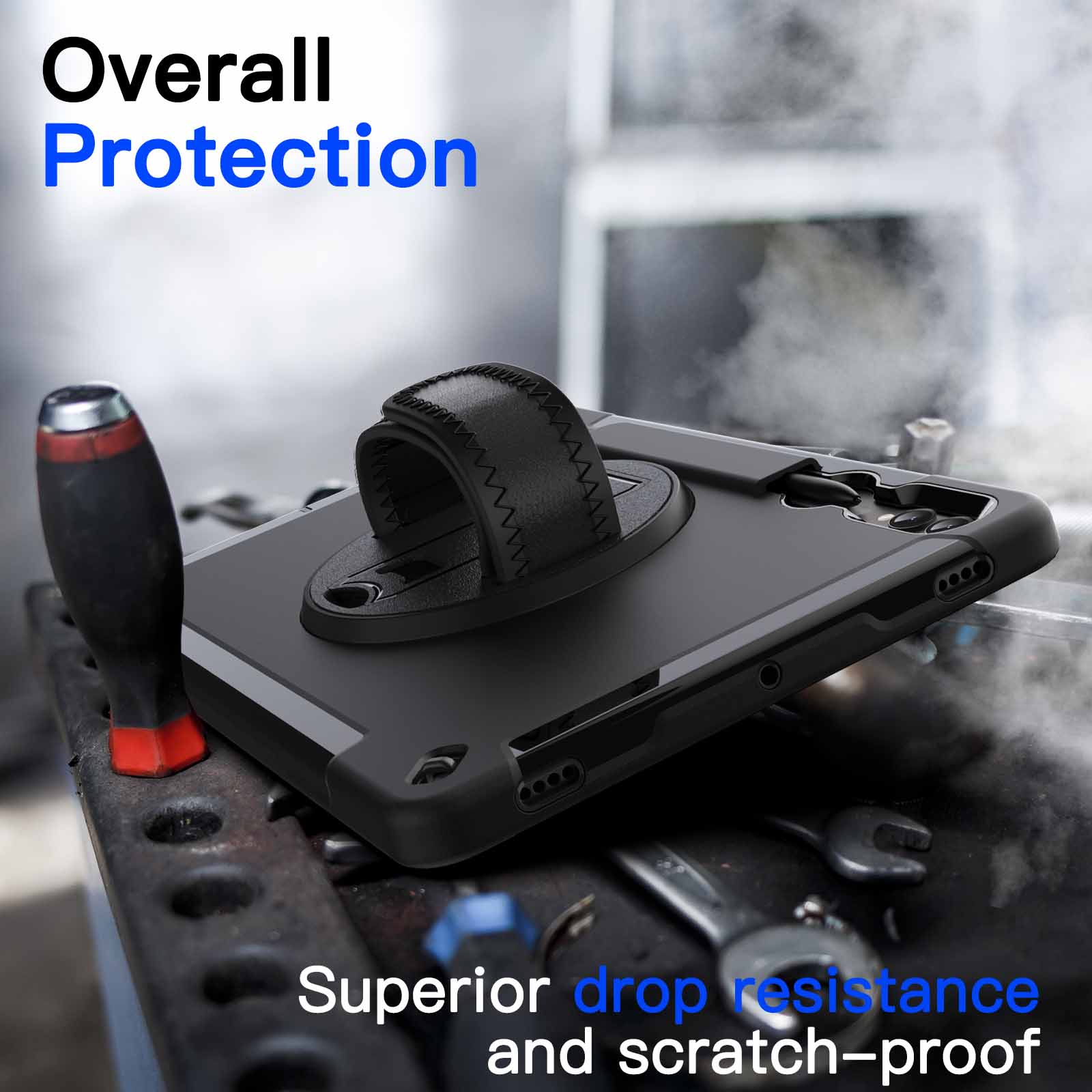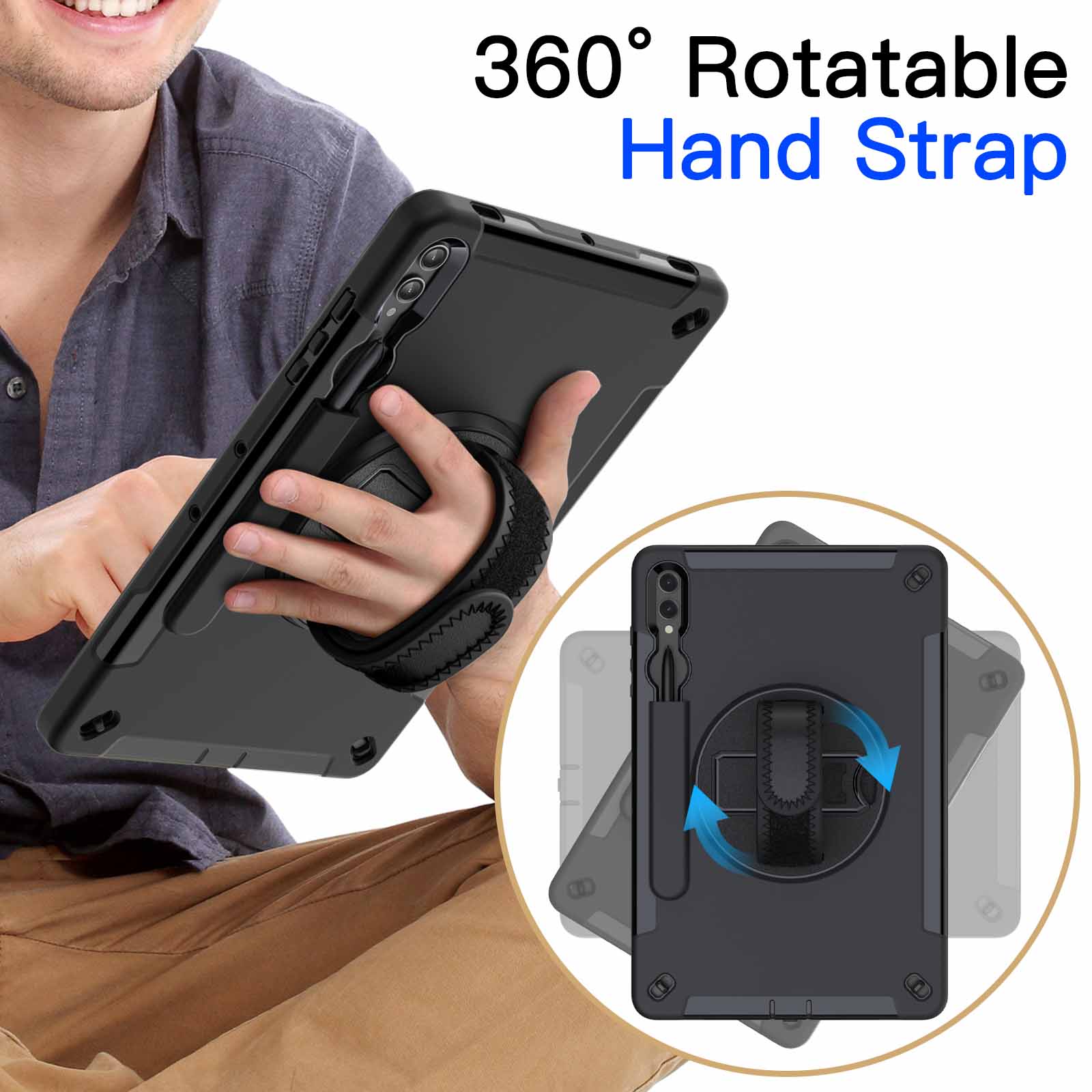 [360?? Rotating Kickstand & Hand Strap] Prop up the tablet in horizontal and vertical angles for hands-free viewing, drawing or typing. And you can firmly hold the tablet with single hand wearing the adjustable hand strap