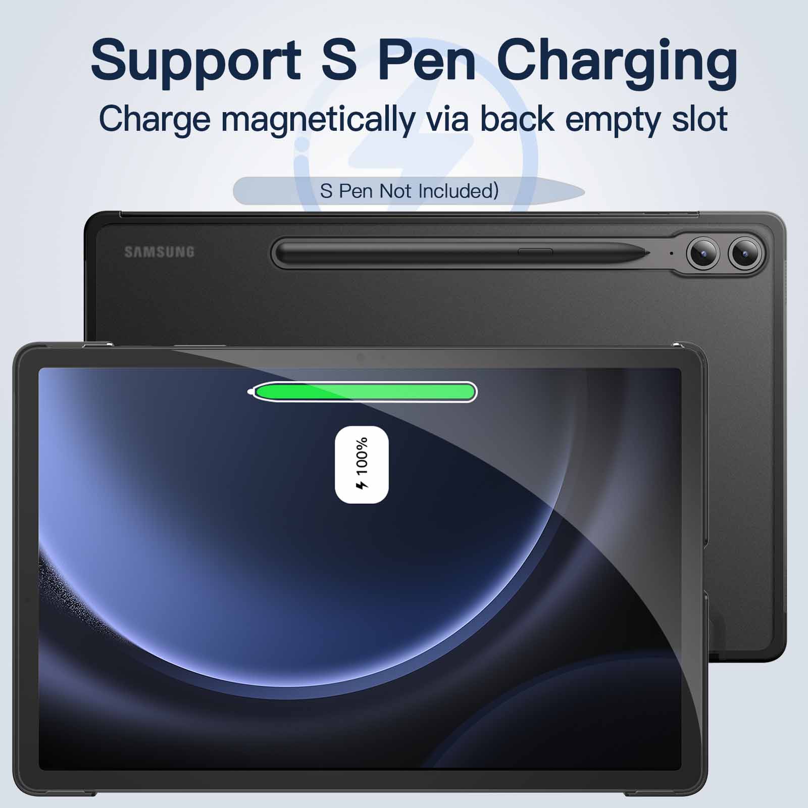 [Designs for S Pen] You can pair and charge your S Pen magnetically through the back slot. Also, there is a wider cutout on the right side for magnetically attaching your S Pen easily (Note: S Pen Not Included)