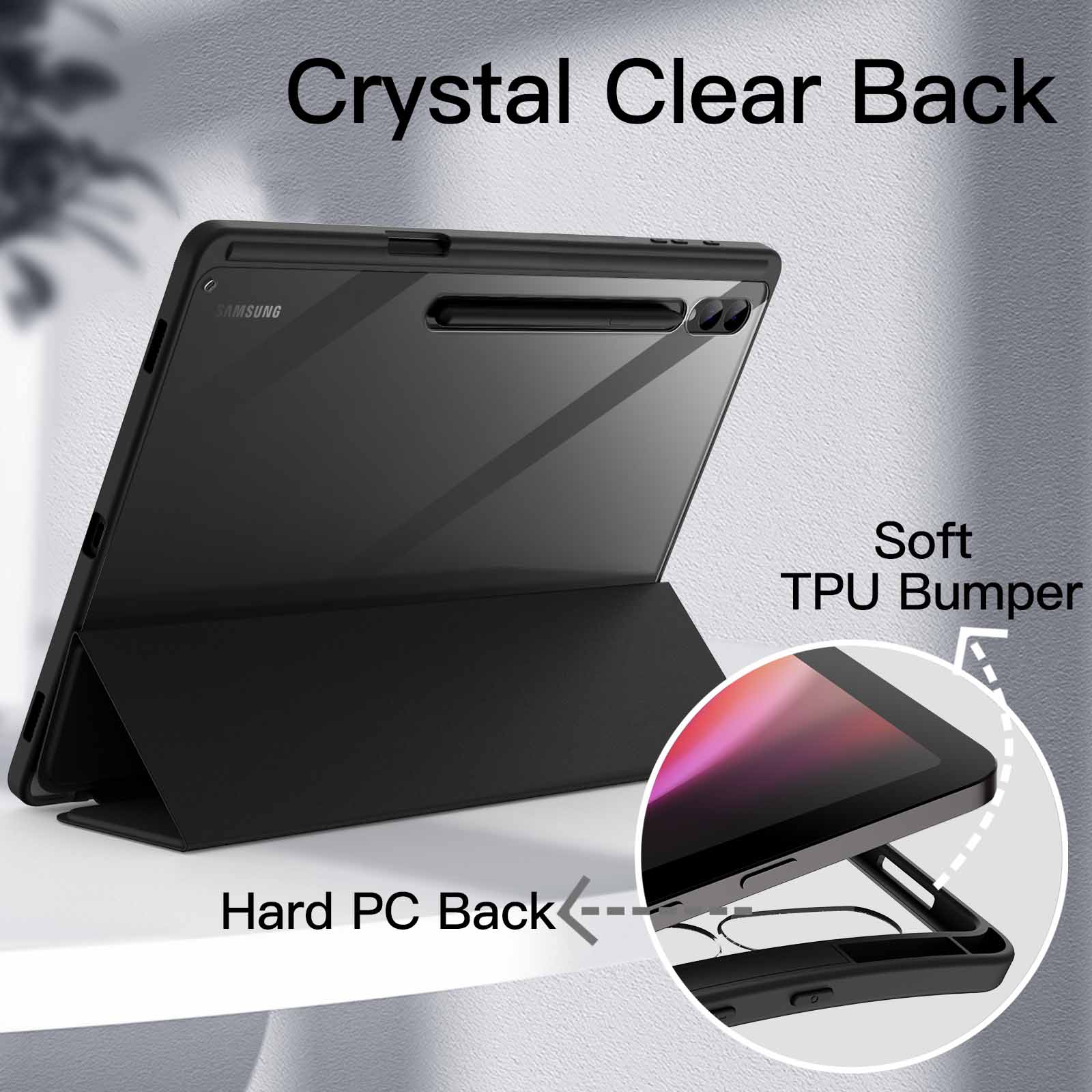 [Transparent PC Back] Built with easy-to-install TPU bumper and hard clear back shell for showing the original beauty of your device, as well as a PU front cover, this full body case highly protects your Tablet against drops and scratches