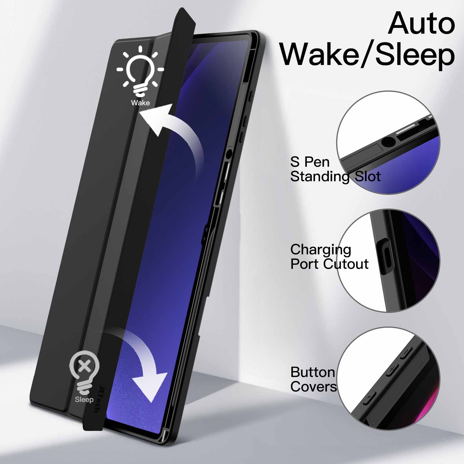 [Auto Wake/Sleep] This protective case with built-in magnets supports automatic sleep/wake function. Wake on open and sleep on close. More energy-saving