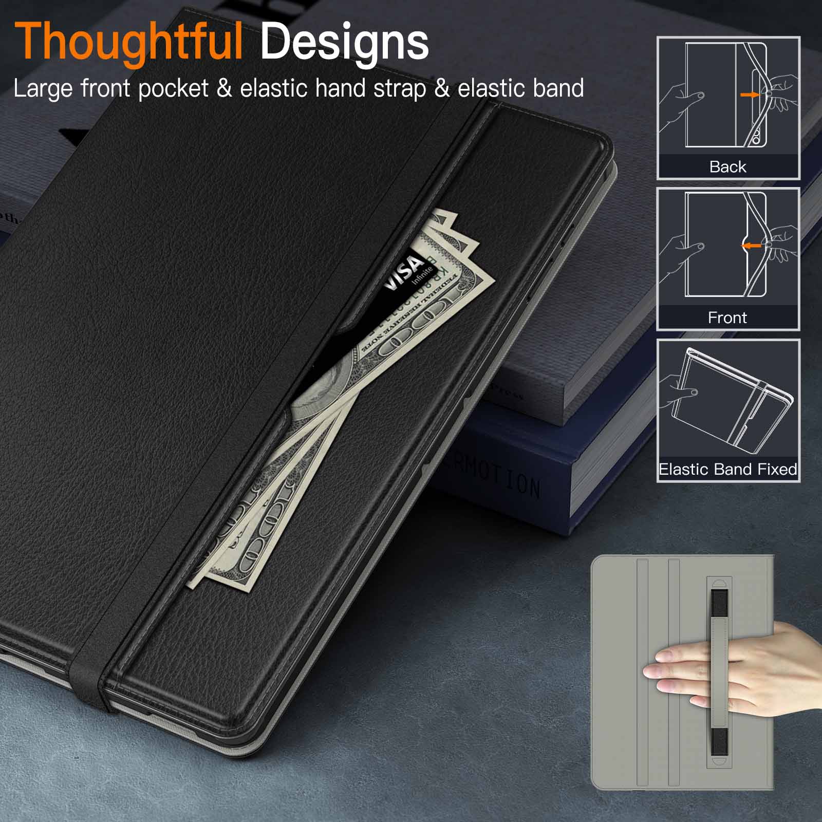 • [Multi-Functional] A large front pocket to store cards, cash, notes and so on. Also come with an exterior elastic strap to fix your tablet tightly to the case, and the adjustable inner hand strap enhances the grip of your device