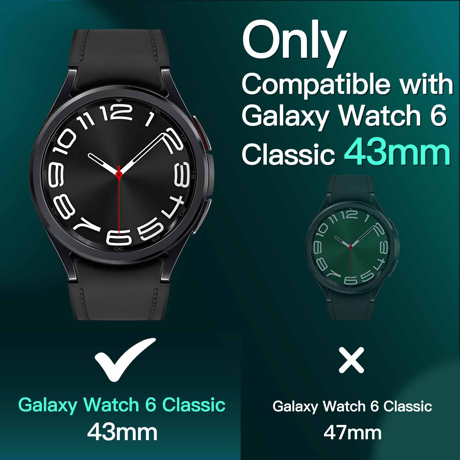 [Compatibility] Only fit for Samsung Galaxy Watch 6 Classic 43mm 2023 released. Fit model number SM-R950NZKACHC. Please double check the number and size of your watch on its back before purchasing