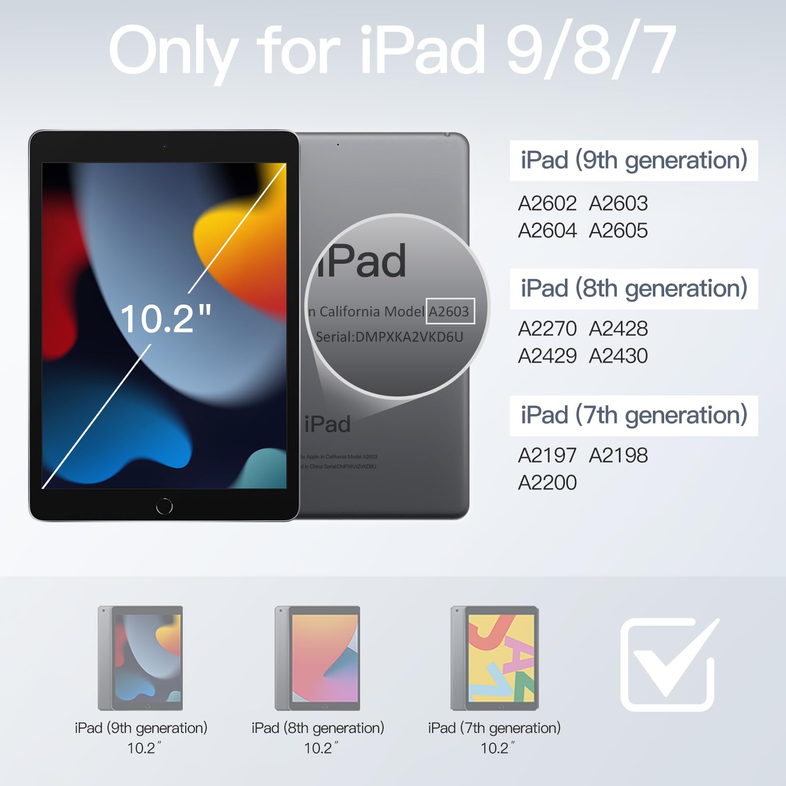 • [Compatibility] Designed for iPad 9/8/7 (10.2-inch, 2021/2020/2019 model, 9th/8th/7th generation). Fit iPad models: A2602 / A2603 / A2604 / A2605 / A2270 / A2428 / A2429 / A2430 / A2197 / A2198 / A2200. Please check the back bottom to find your iPad model number