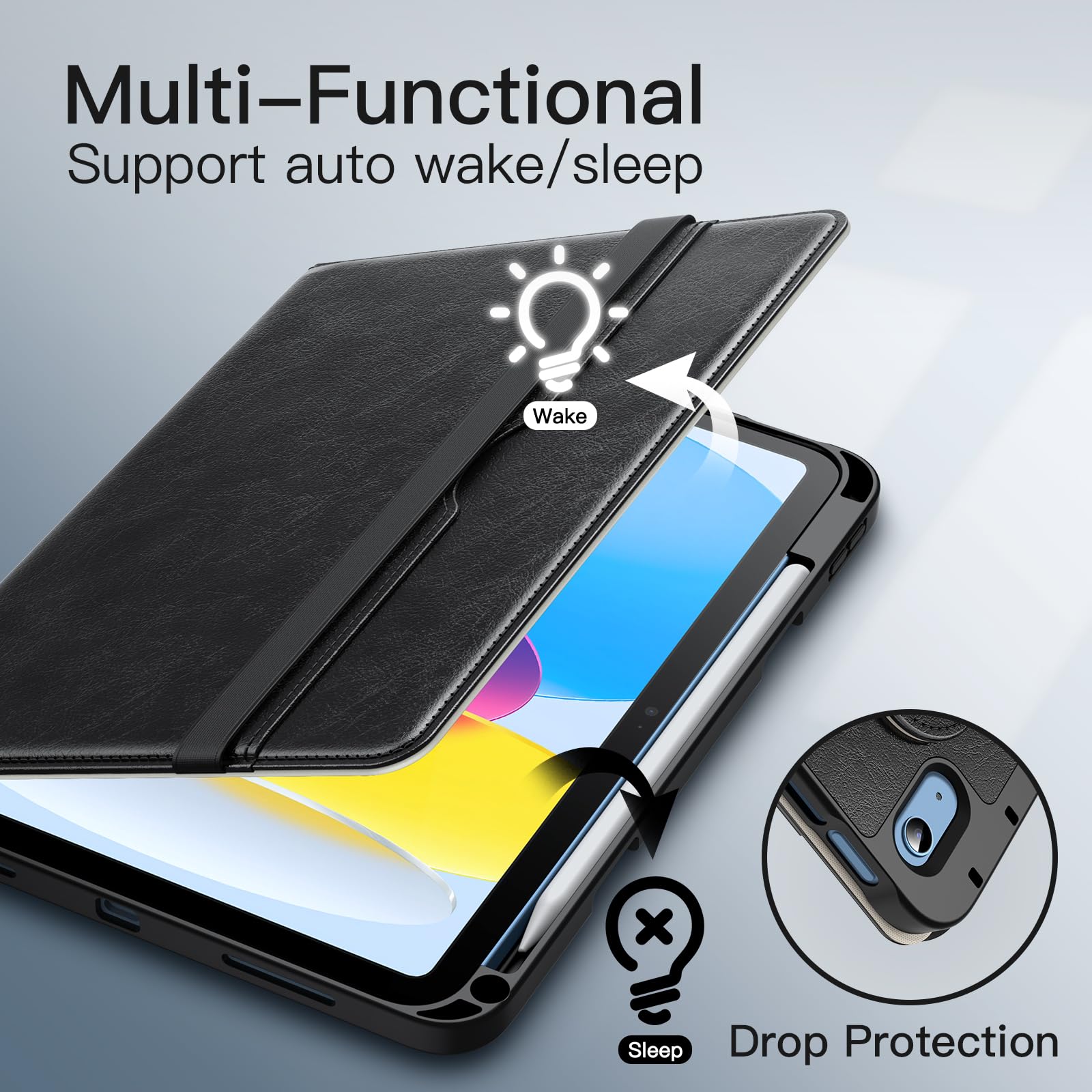 [Quality Materials] Built with a premium PU leather exterior and a soft TPU inner back. Highly protect your iPad against scratches and drops. Durable, classic and comfortable to touch