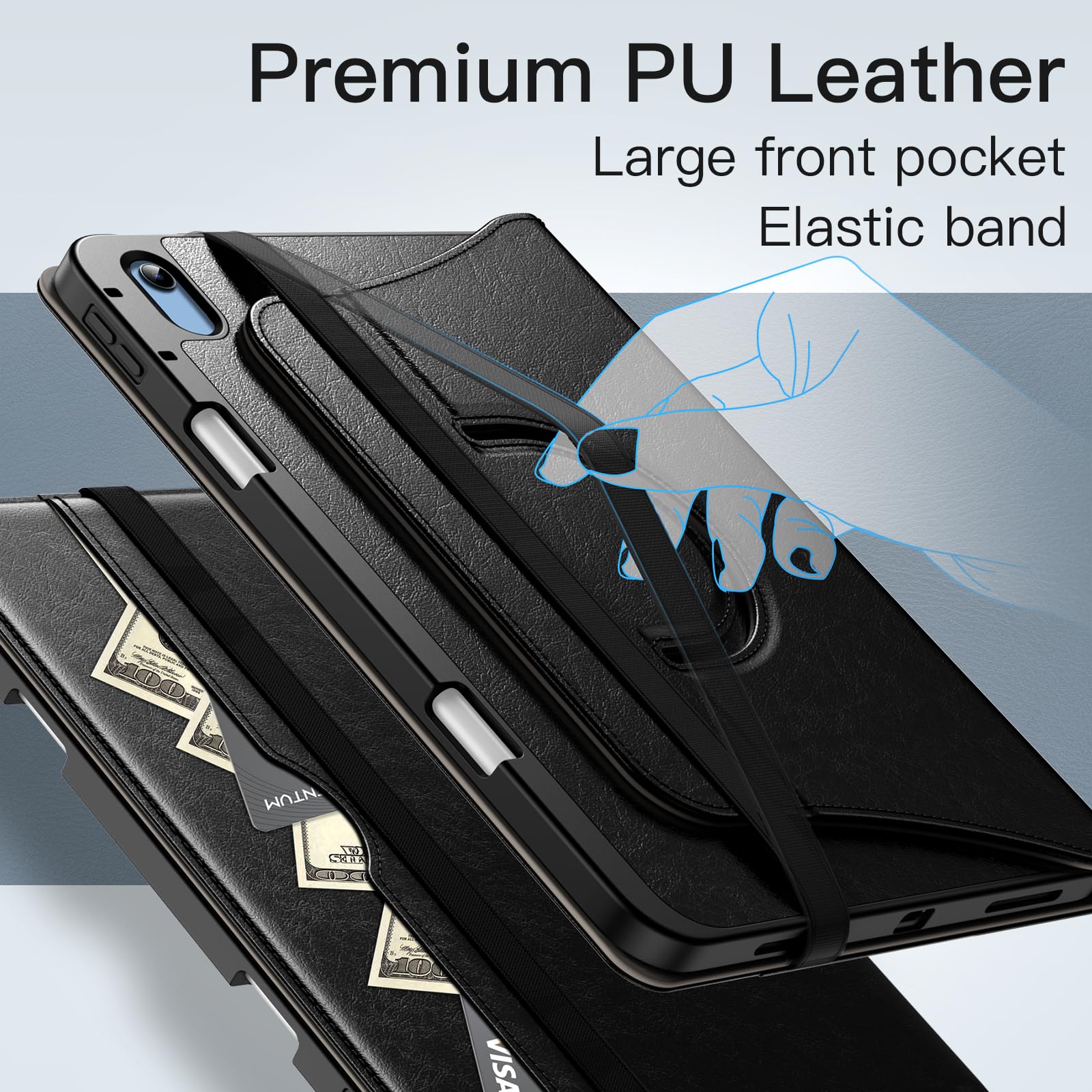 [Multi-Function] A large front pocket to store cards, cash, notes and so on. Also come with an exterior elastic strap to fix iPad tightly to the case, and the adjustable inner hand strap helps you firmly hold your iPad