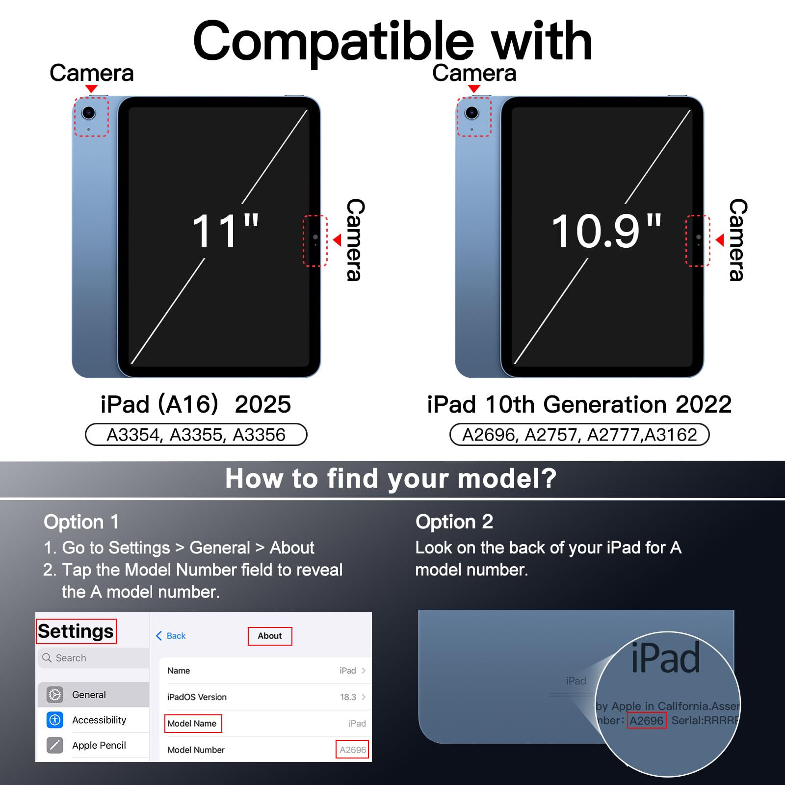 • [Compatibility] Designed for iPad (A16) 11th/10th generation (2025/2022). Fit iPad Models: A3354 / A3355 / A3356 / A2696 / A2757 / A2777 / A3162. Please Go to Settings > General > About, then tap the Model Number field to reveal the A model number