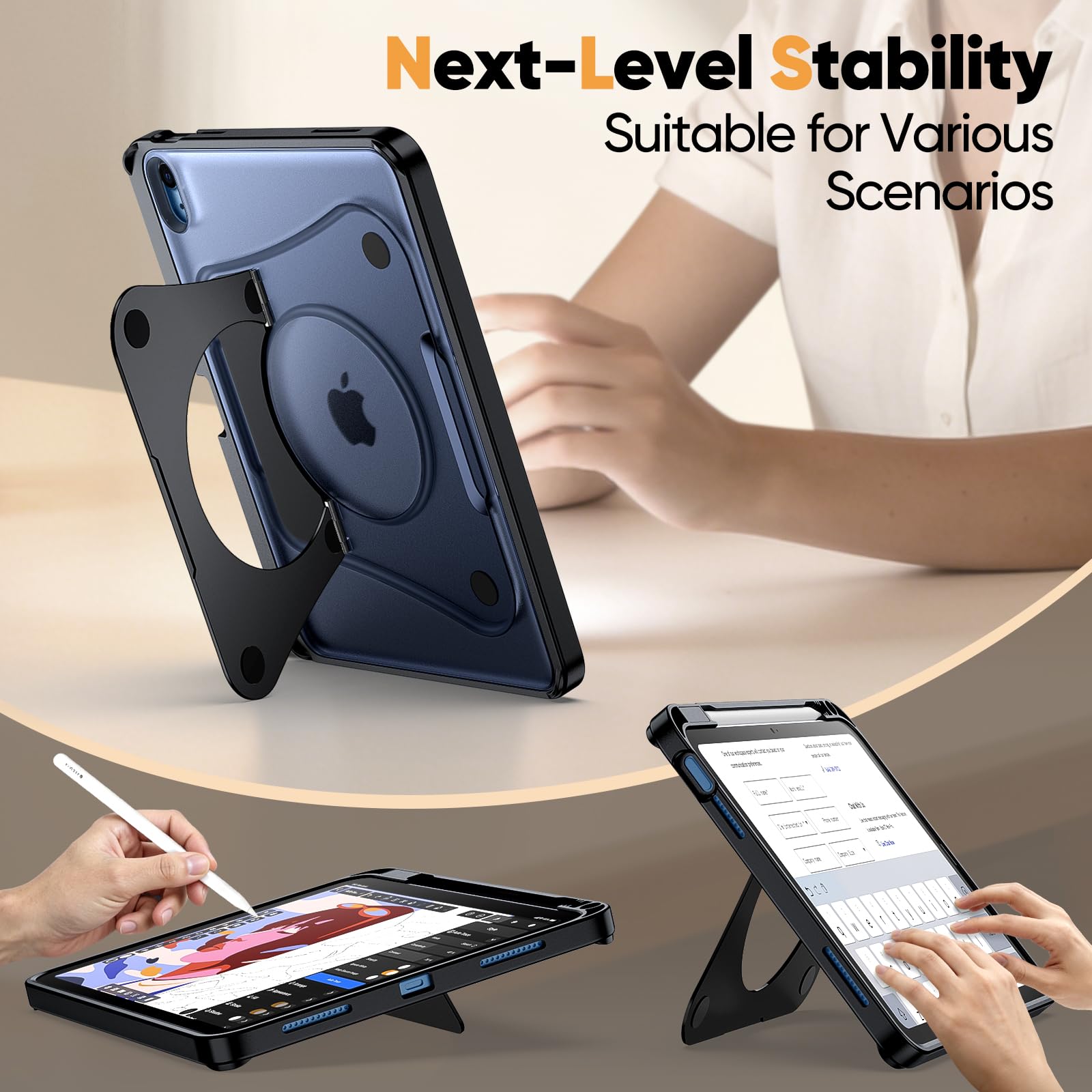 [Multi-Angle Adjustment] The dual-stand design adapts flexibly to different scenarios. The smaller stand positions your device perfectly for detailed drawing and efficient typing. The larger stand offers a wide range of adjustable angles and supports both landscape and portrait modes, enabling optimal viewing comfort in any situation