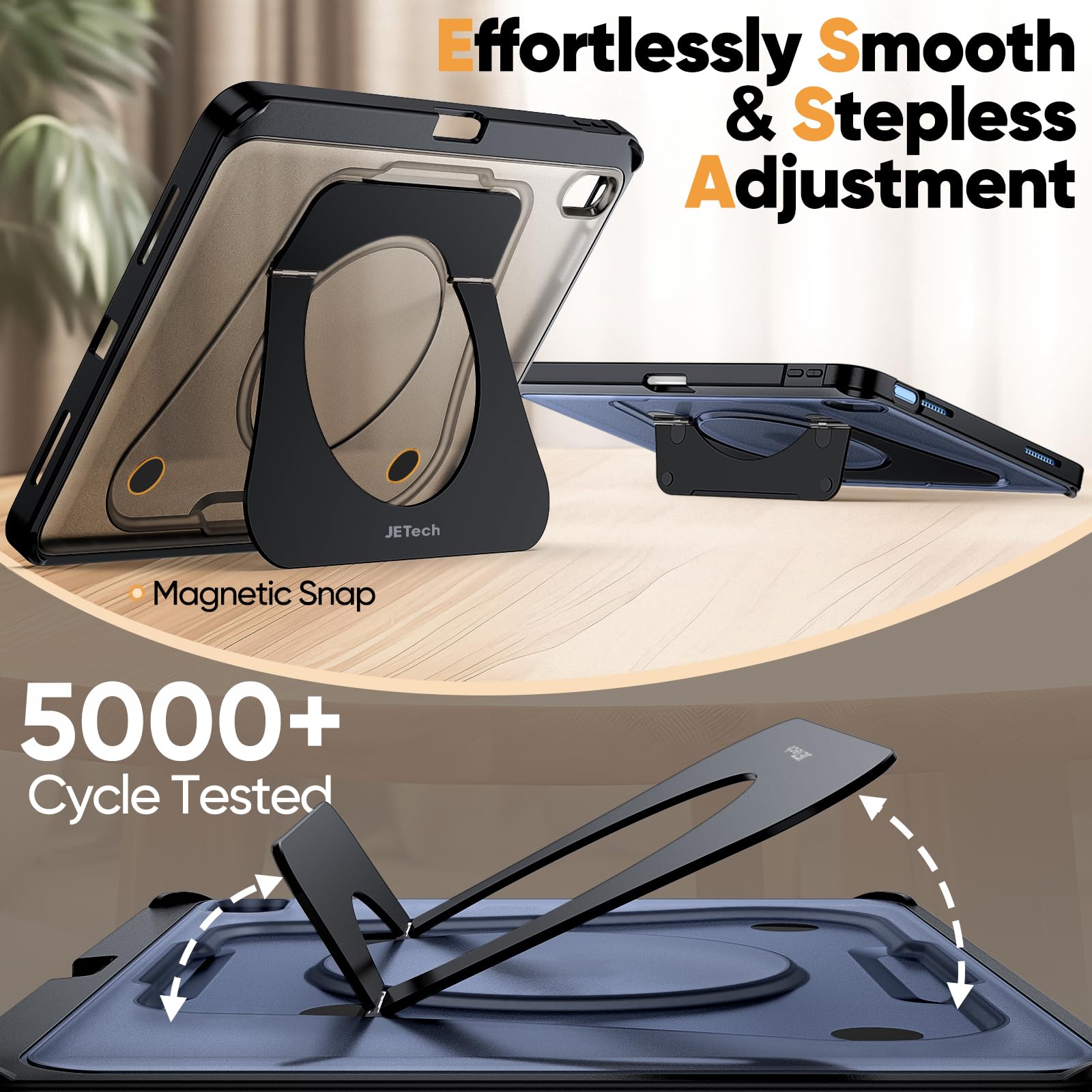 [Sturdy & Durable] Constructed with a rigid aluminum alloy stand and precision hinges, the stand delivers rock-solid stability even after 5,000 open-close cycles. Meanwhile, its unique magnetic design keeps the larger stand securely in place, preventing popping up over time