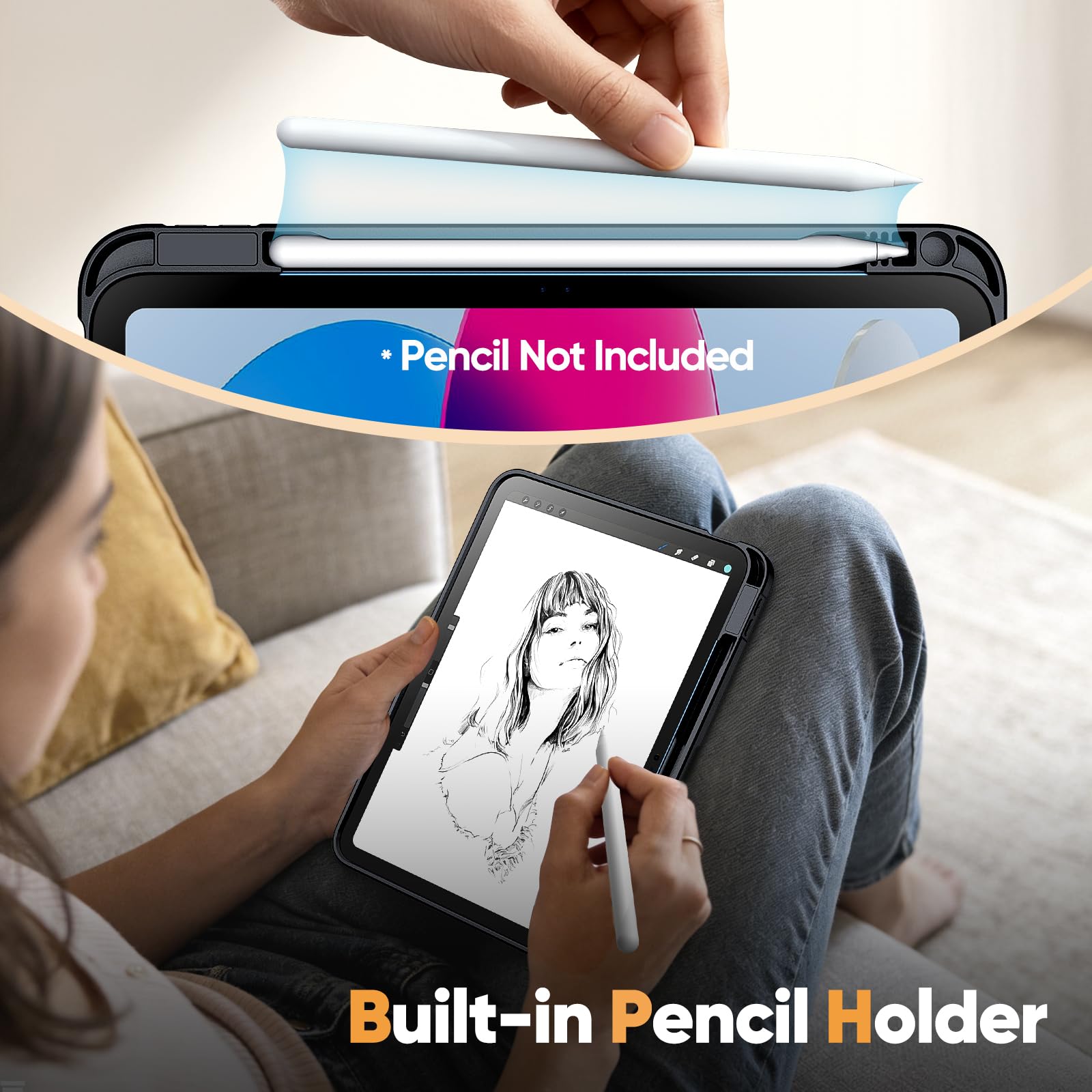 [Easy to Use] Built-in Pencil holder keeps your Pencil always with the device (Note: Pencil NOT Included). Additionally, precise cutouts allow easy access to the device’s speaker, camera, and other functions. The thoughtfully designed silicone pads effectively absorb noise for a gentle closure