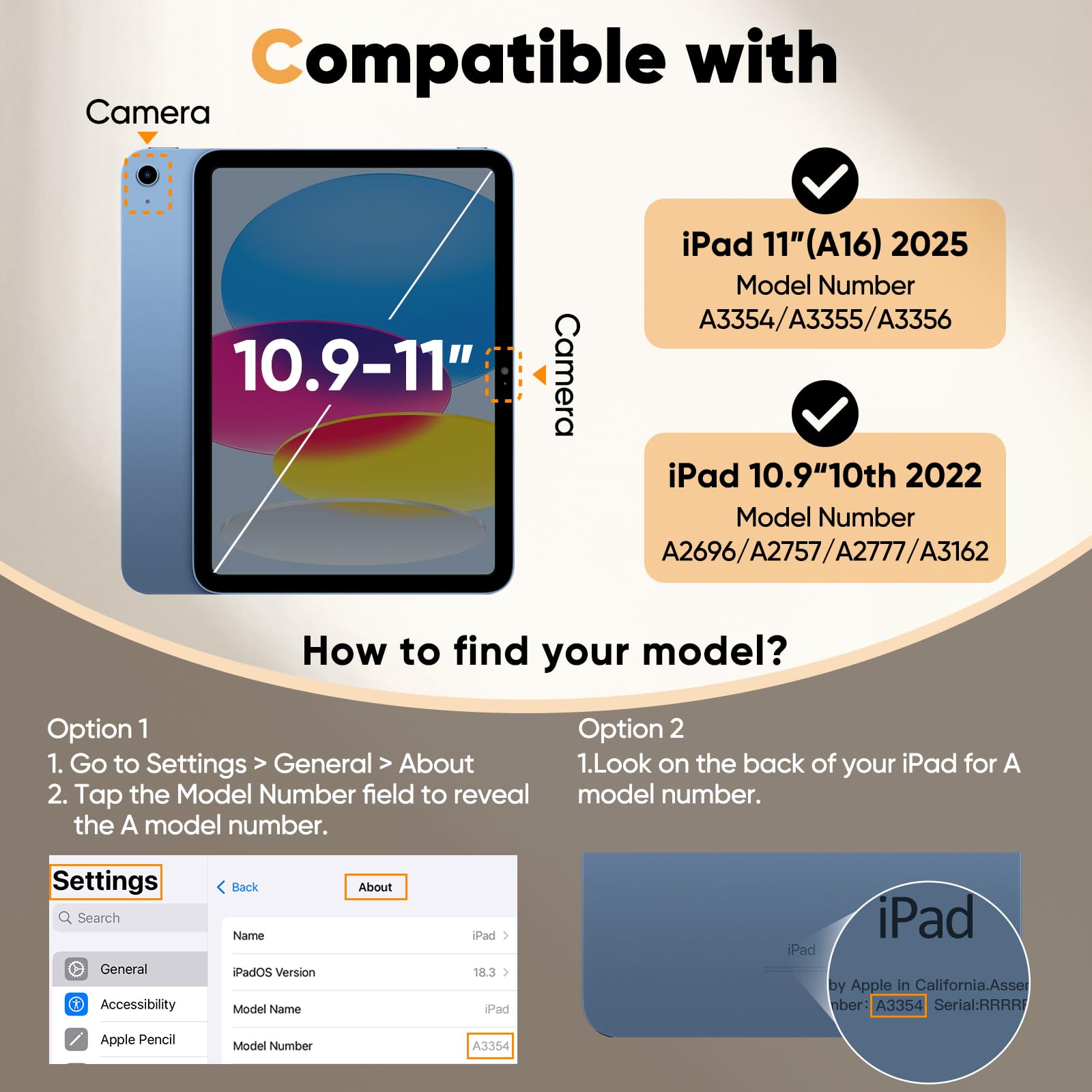 [Compatibility] Designed for iPad (A16) 11th/10th generation (2025/2022). Fit iPad Models: A3354 / A3355 / A3356 / A2696 / A2757 / A2777 / A3162. Please Go to Settings > General > About, then tap the Model Number field to reveal the A model number
