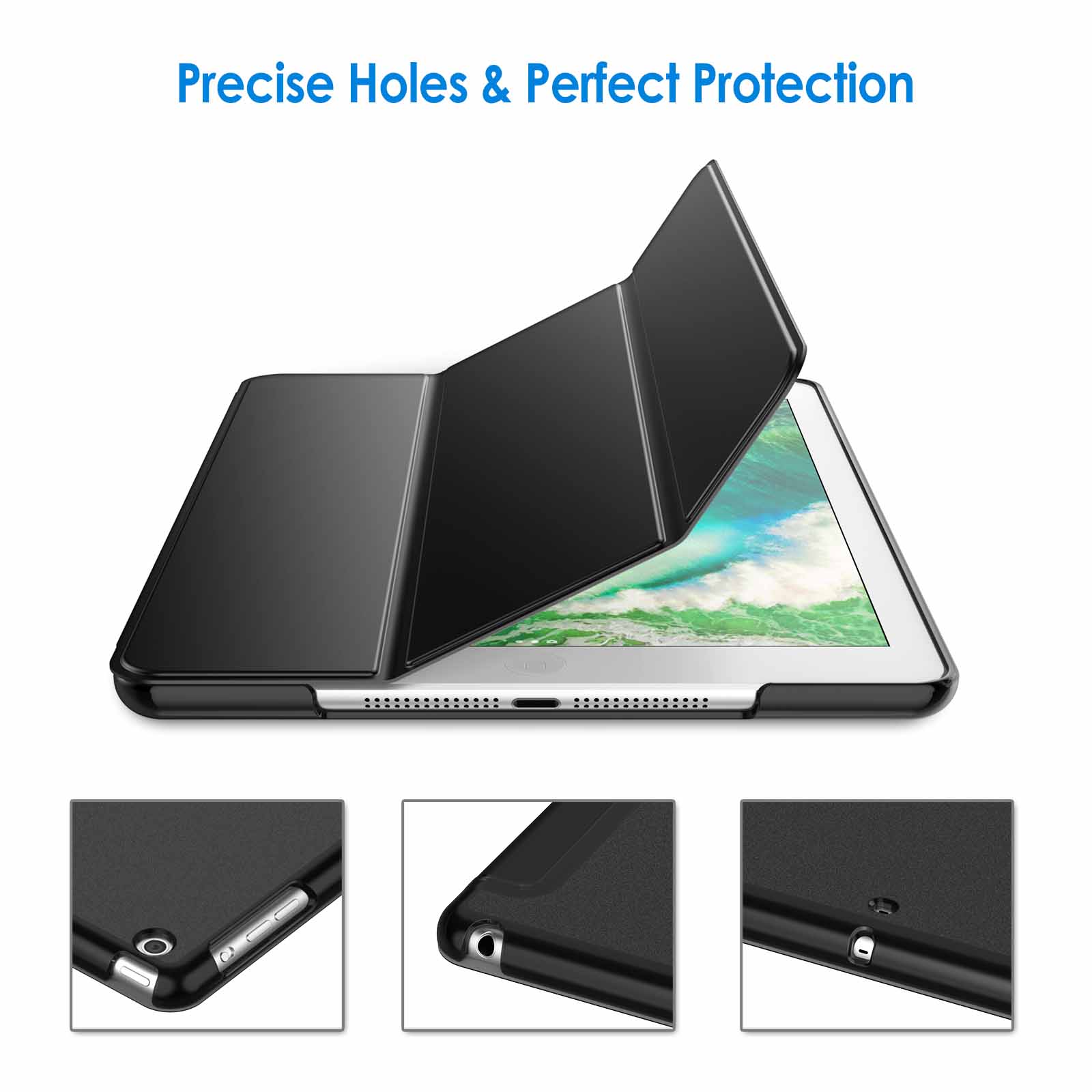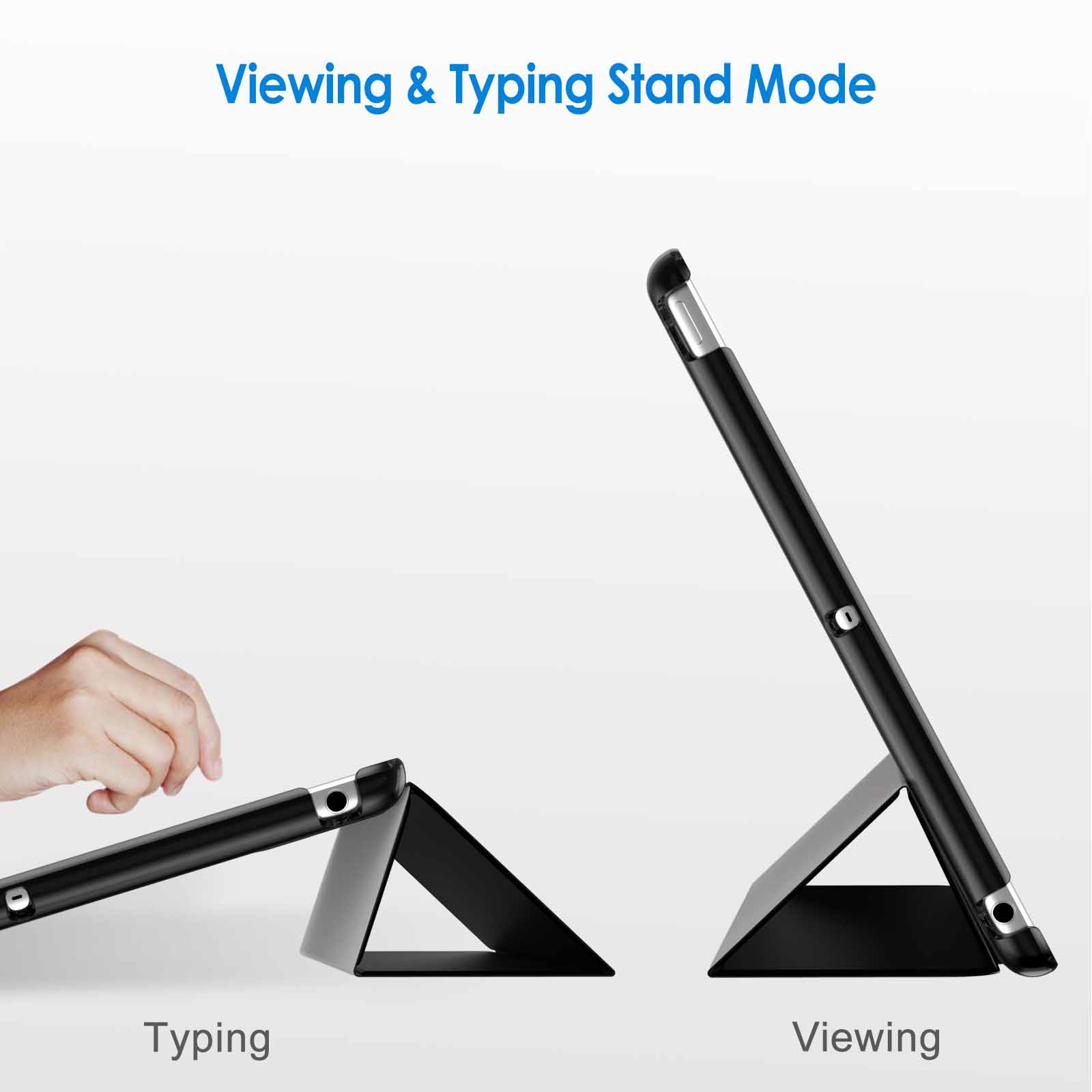 • Magnetic smart cover supports automatic sleep/wake function.The tri-fold front cover can support iPad in two standing position for viewing and typing
