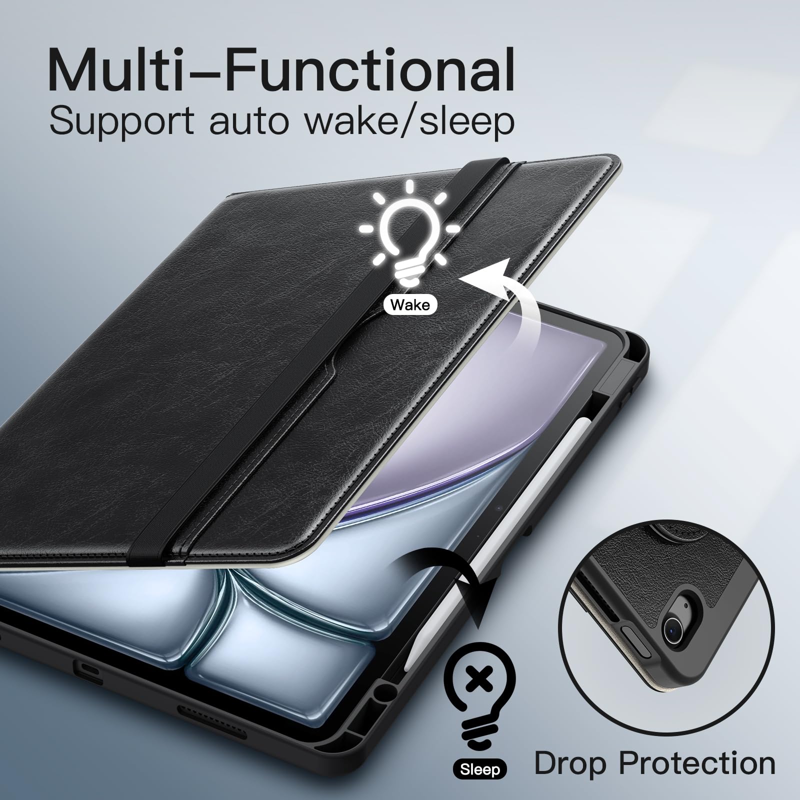 • [Auto Wake/Sleep] Wake on open and sleep on close. In addition, built-in pencil holder on the right side allows you to securely store your pencil in the slot (Pencil NOT Included)