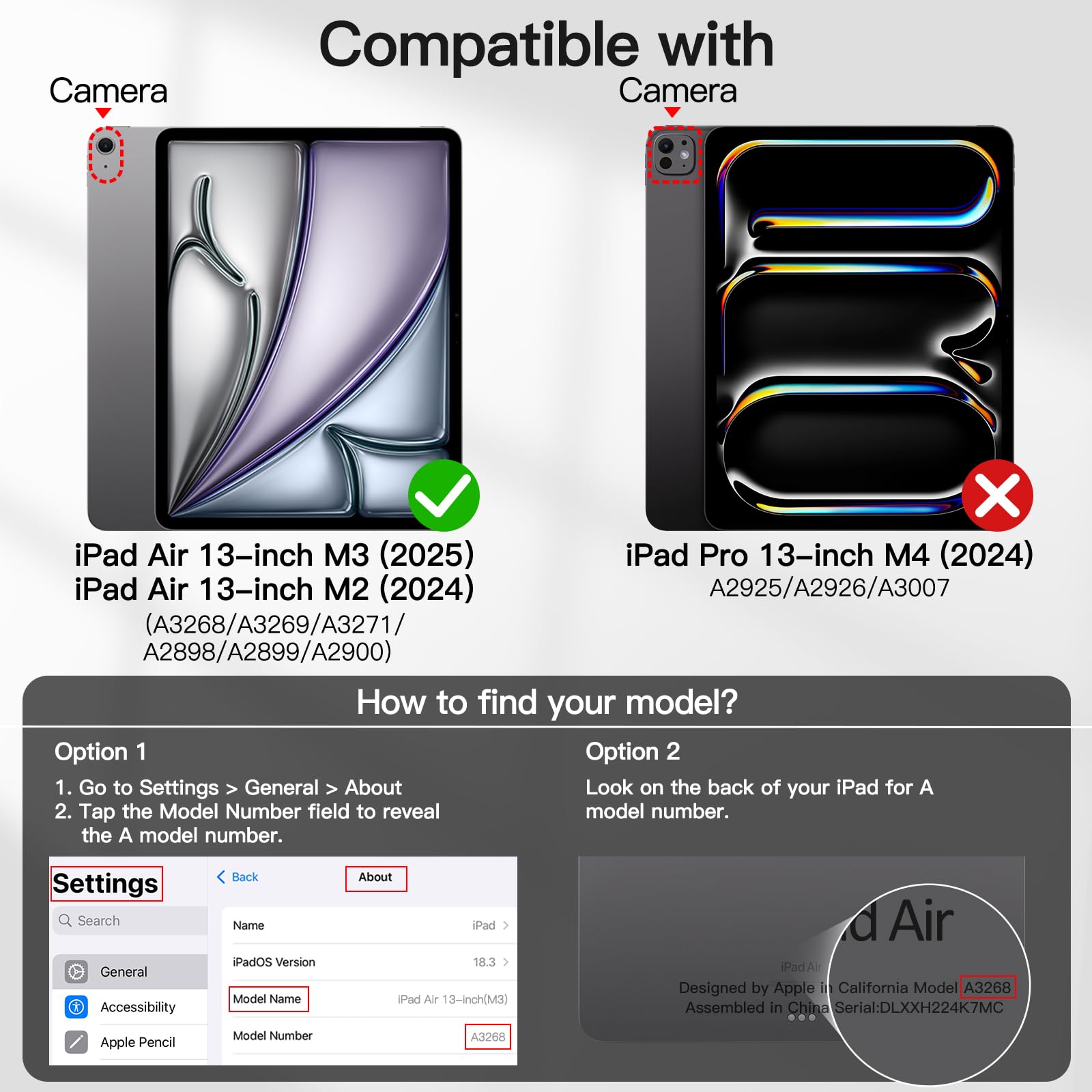 • [Compatibility] Designed for iPad Air 13-inch M3/M2 (2025/2024). Fit iPad Model Numbers: A3268 / A3269 / A3271 / A2898 / A2899 / A2900. Please Go to Settings > General > About, then tap the Model Number field to reveal the A model number