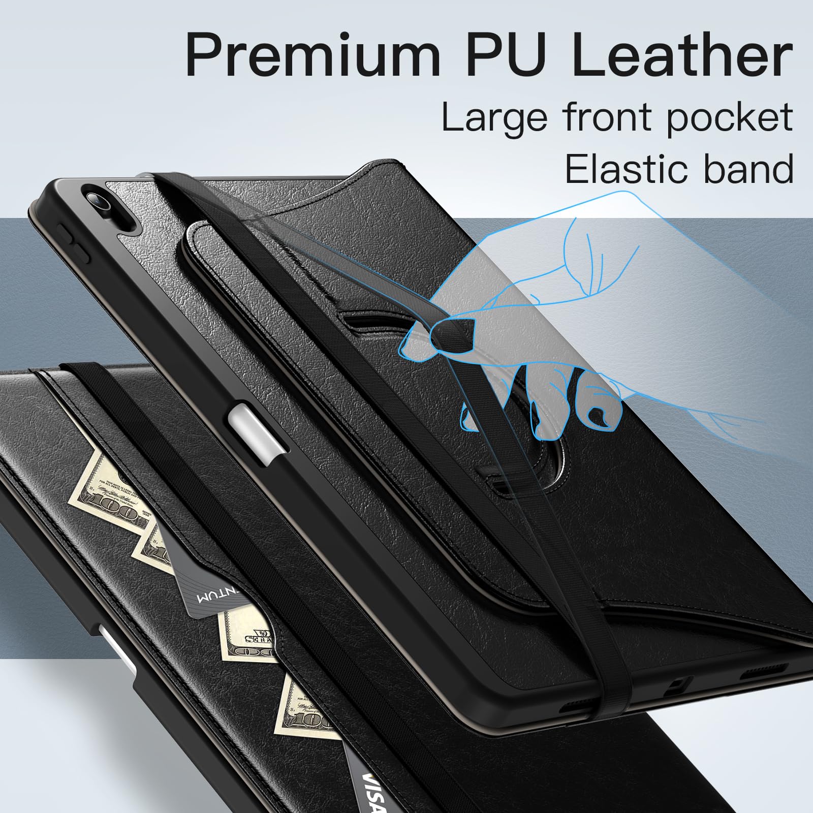 • [Multi-Function] A large front pocket to store cards, cash, notes and so on. Also come with an exterior elastic strap to fix iPad tightly to the case, and the adjustable inner hand strap helps you firmly hold your iPad