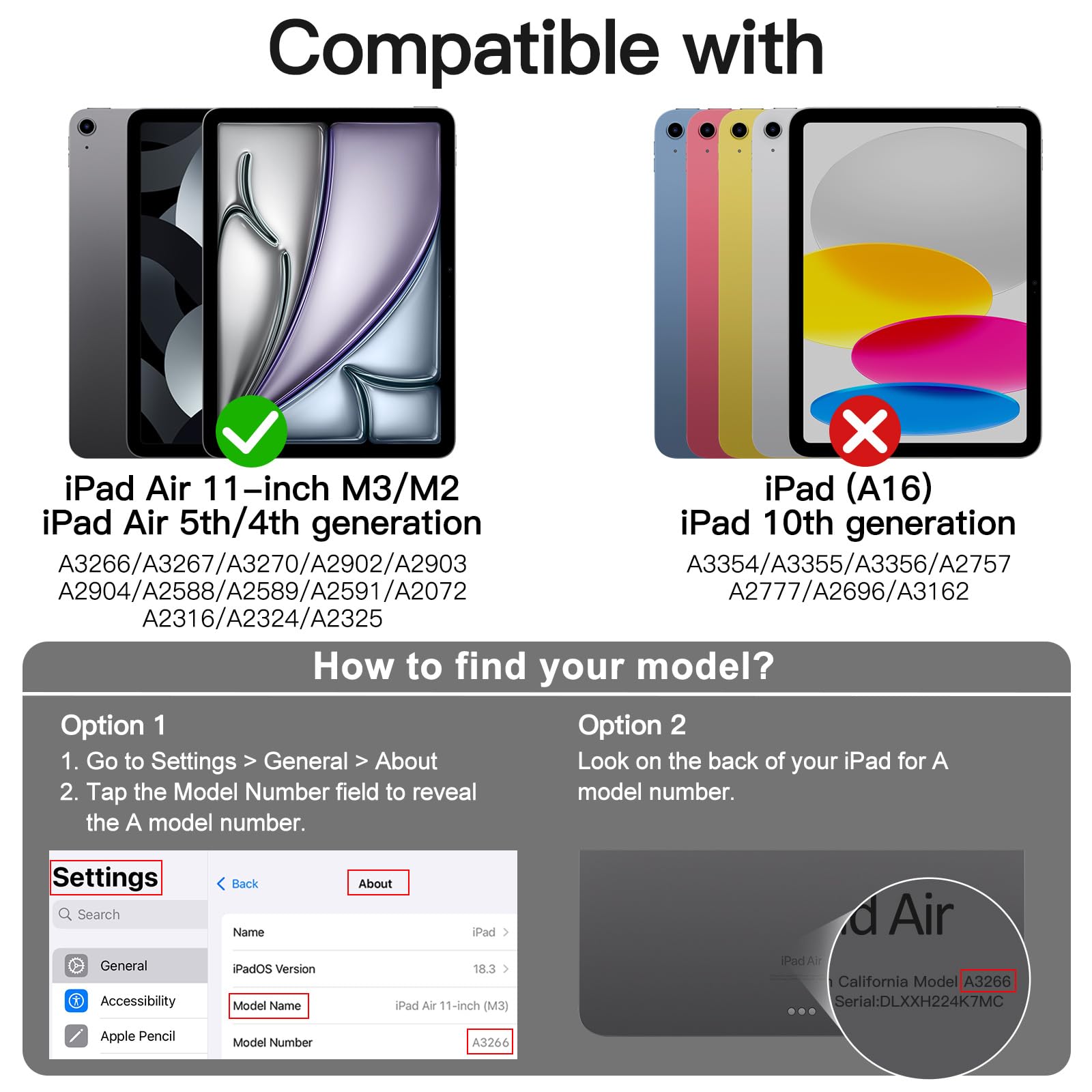 [Compatibility] Supports Pencil Pro/Pencil(USB-C). Designed for iPad Air 11-Inch M3/M2 (2025/2024), iPad Air 5/4 (2022/2020 5th/4th Generation 10.9-Inch). Fit iPad Models: A3266 / A3267 / A3270 / A2902 / A2903 / A2904 / A2588 / A2589 / A2591 / A2324 / A2072 / A2316 / A2325. Please Go to Settings > General > About, then tap the Model Number field to reveal the A model number