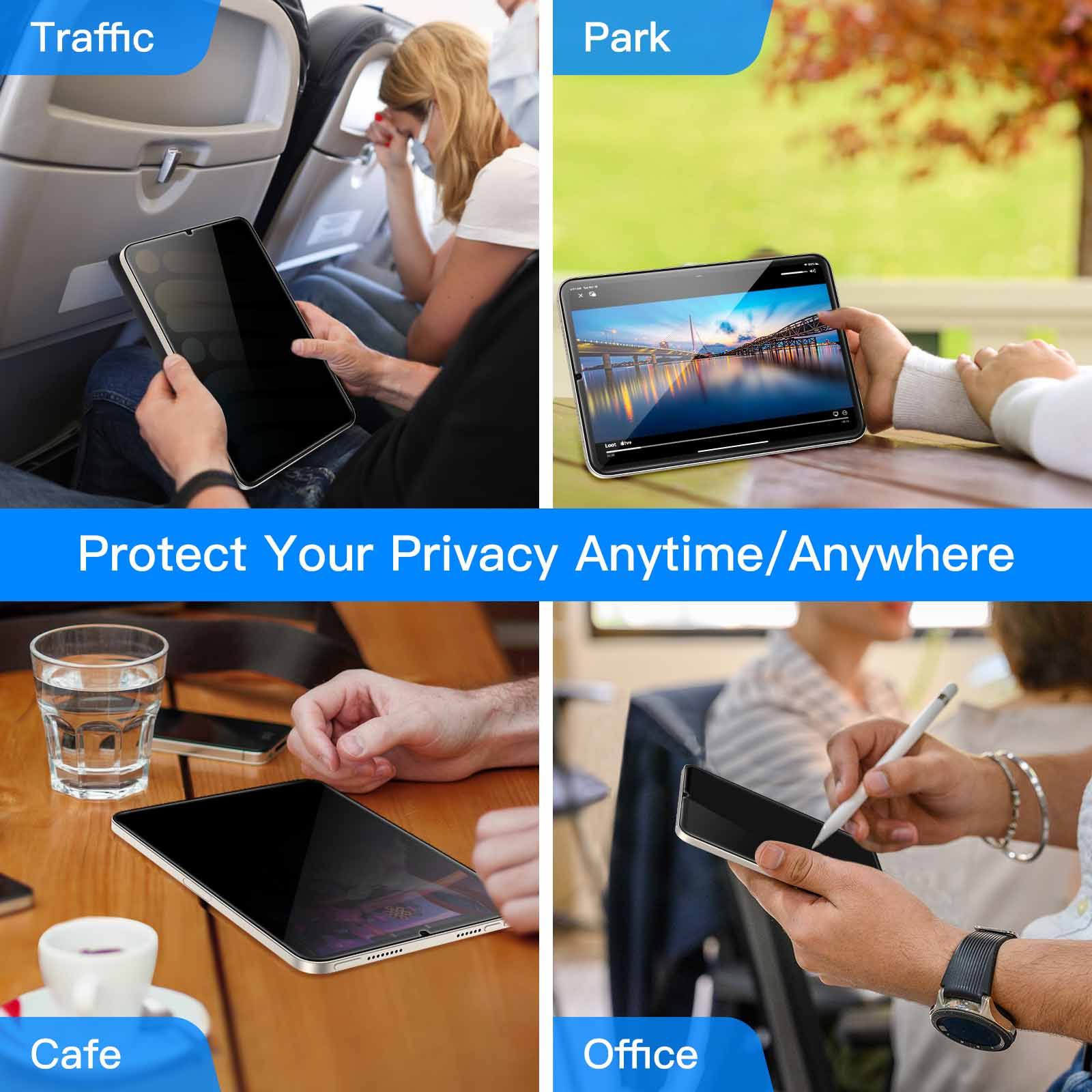 • [Privacy Protection] When the iPad is held horizontally, the screen is only visible to persons directly in front of screen, protecting your privacy from peeping by strangers. (Note that the protector will darken the screen a little for a better anti-spy effect. And you can turn up the display brightness for better viewing experience)