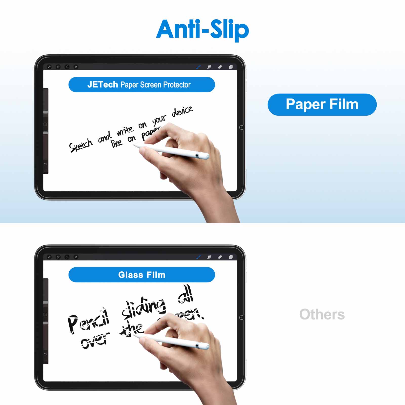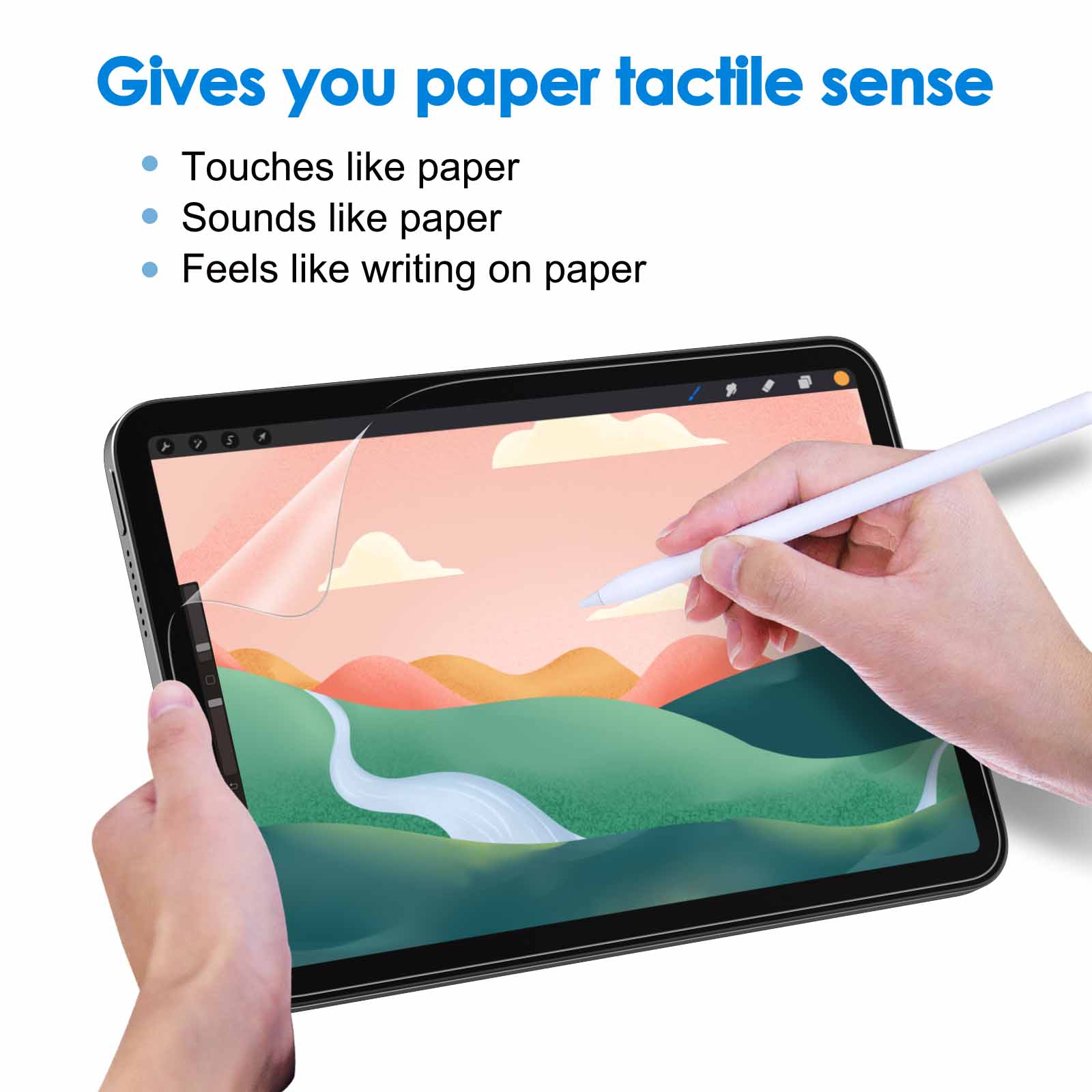 [Enjoyable Using Experience] The matte PET film is compatible with Pencil, just like writing, touching on paper and sounding as paper, scratch-resistant and anti-fingerprints. Non-slip and highly responsive. Mainly used for drawing, writing and note-taking
