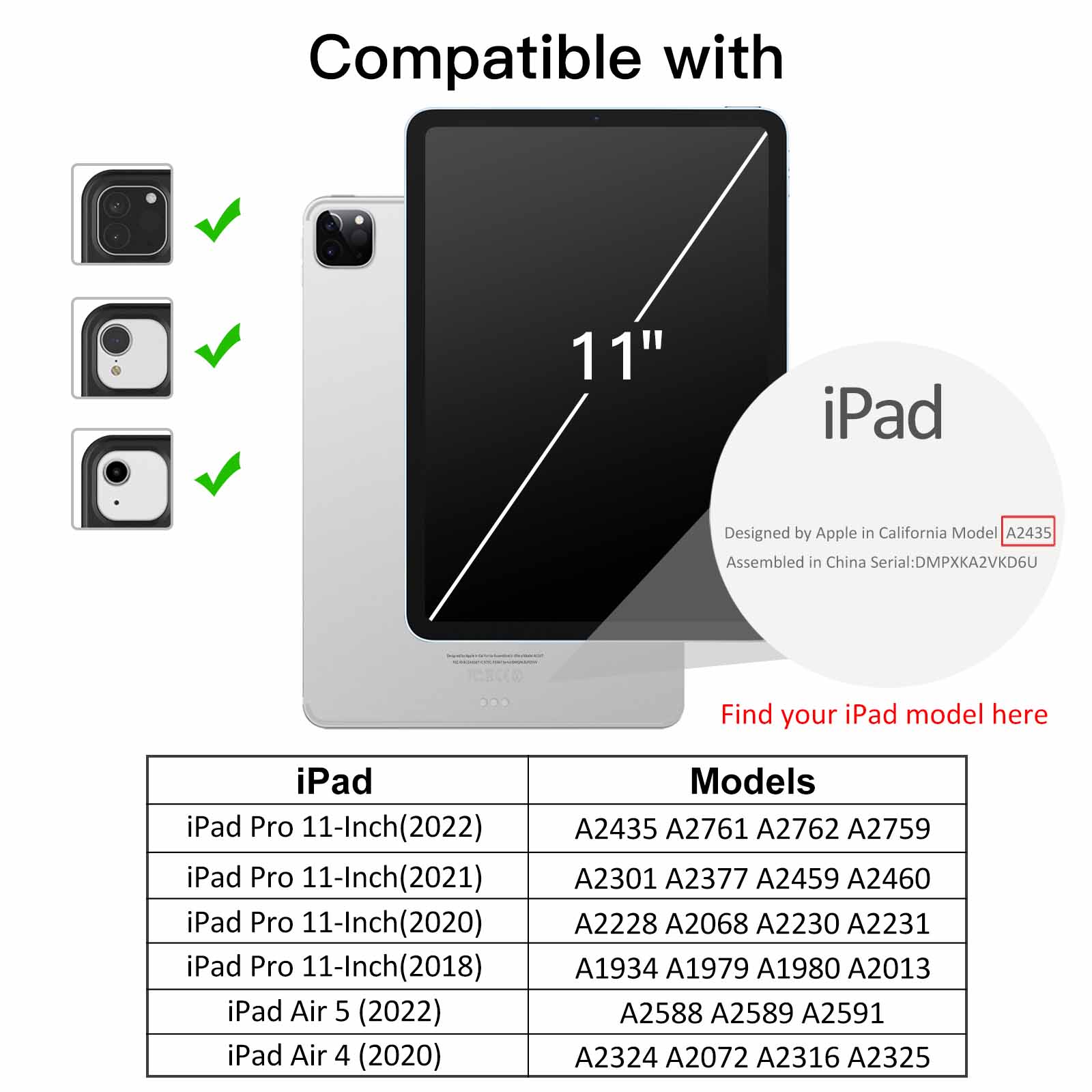 [Compatibility] Perfectly designed for iPad Pro 11 inch (2022/2021/2020/2018 model), iPad Air 5/4 (10.9-inch, 2022/2020). Fit models: A2759 / A2435 / A2761 / A2762 / A2377 / A2301 / A2459 / A2460 / A2228 / A2068 / A2230 / A2231 / A1980 / A2013 / A1934 / A1979 / A2588 / A2589 / A2591 / A2324 / A2072 / A2316 / A2325 (NOT FOR iPad Pro 11-inch 2024 model)