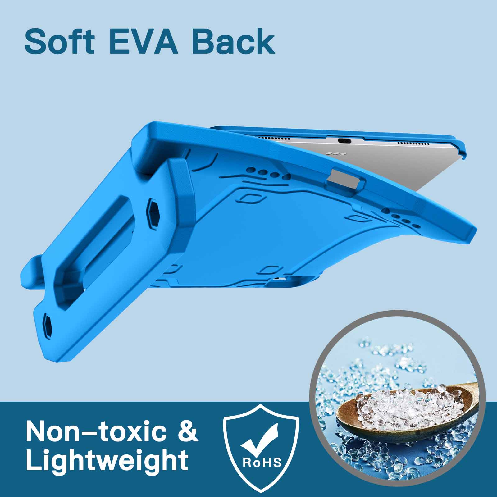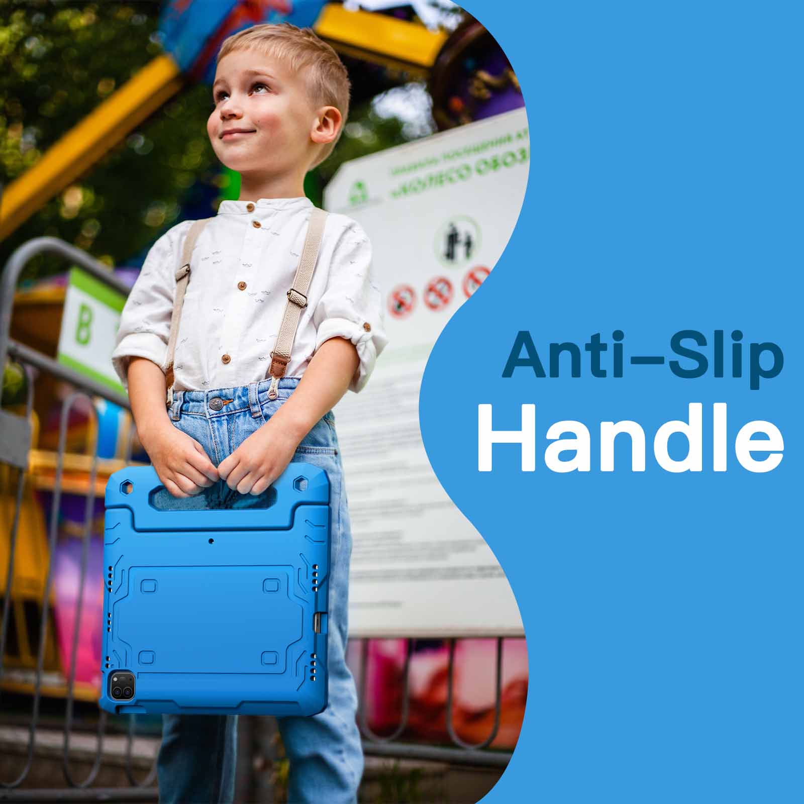 [Versatile Stand] Designed with a kid-friendly handle with anti-slip texture. It is easy for kids to carry around and fold it back to convert into a sturdy stand for hands-free viewing and comfortable typing