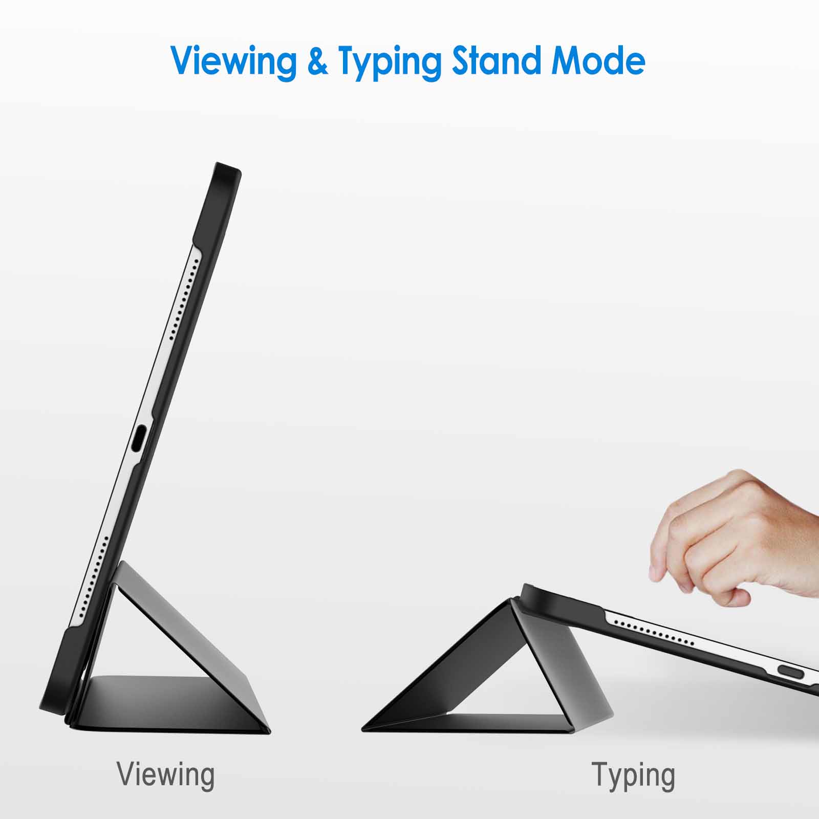 Magnetic smart cover supports automatic sleep/wake function. The tri-fold front cover can support iPad in two standing positions for viewing and typing