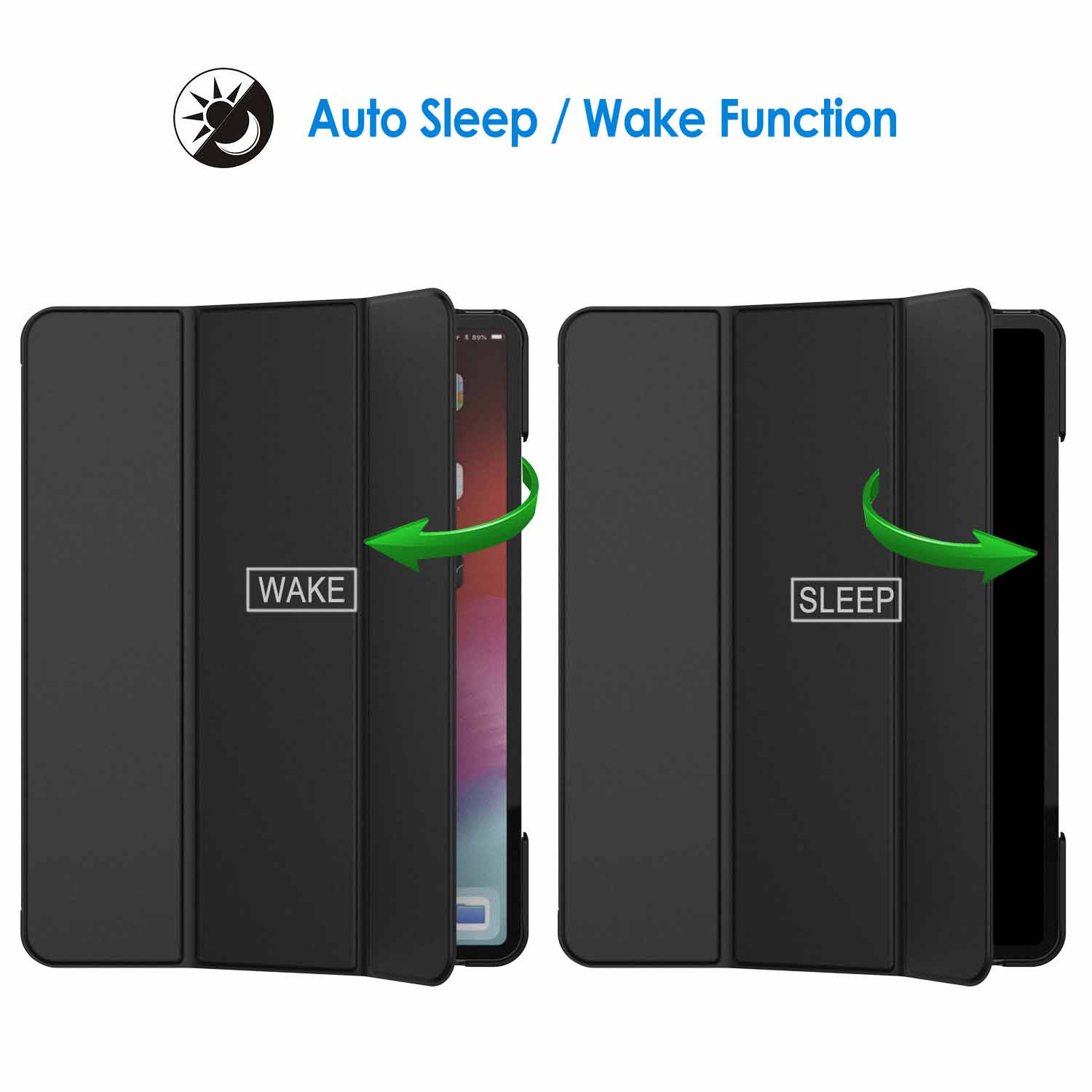 Magnetic smart cover supports automatic sleep/wake function. The tri-fold front cover can support iPad in two standing position for viewing and typing