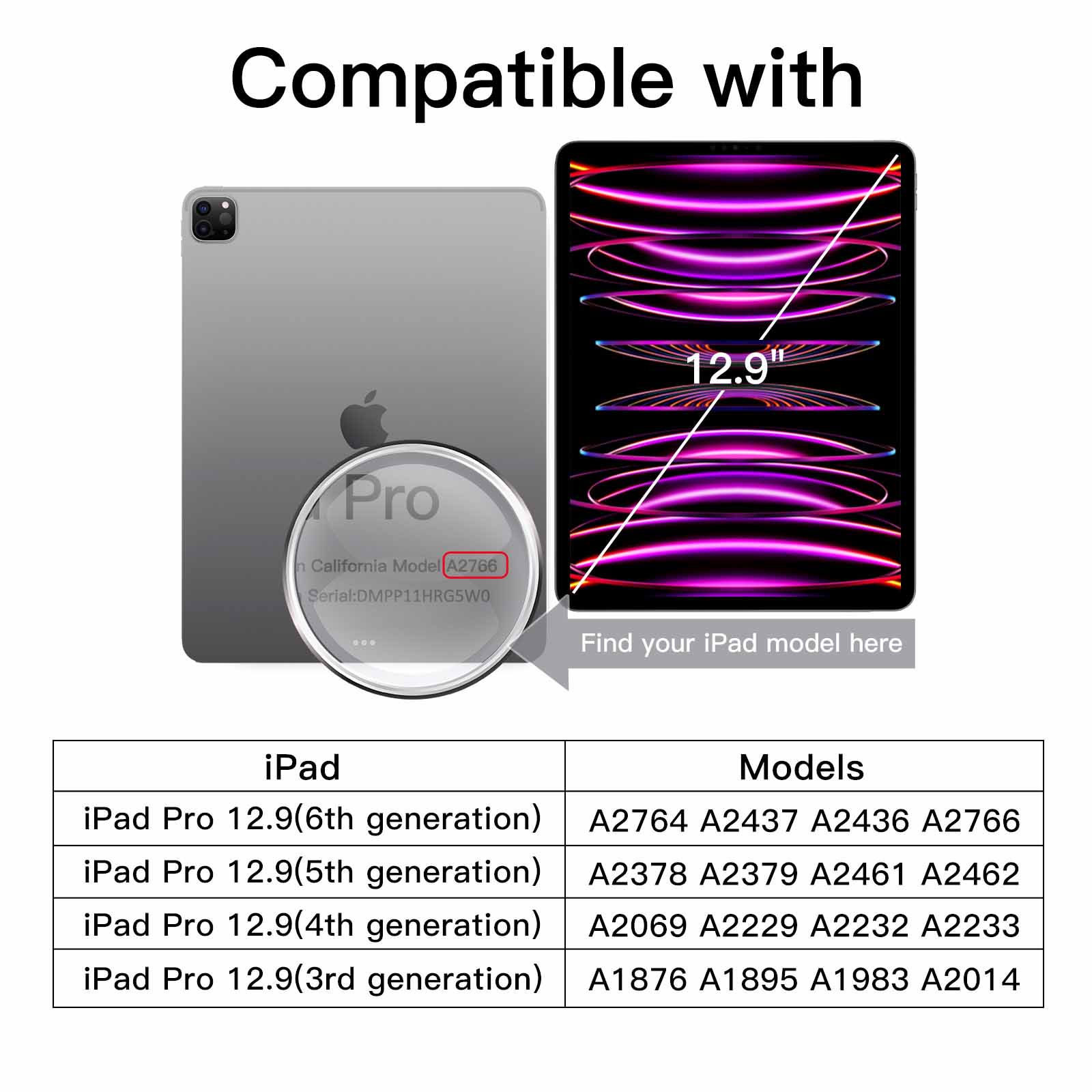 [Compatibility] Exclusively fit iPad Pro 12.9-Inch 2022/2021/2020/2018 (6th/5th/4th/3rd Generation). Fit Models: A2378/A2379/A2461/A2462/A2069/A2229/A2232/A2233/A1876/A1895/A1983/A2014/A2436/A2764/A2437/A2766. Please check back bottom of your iPad to find the model number