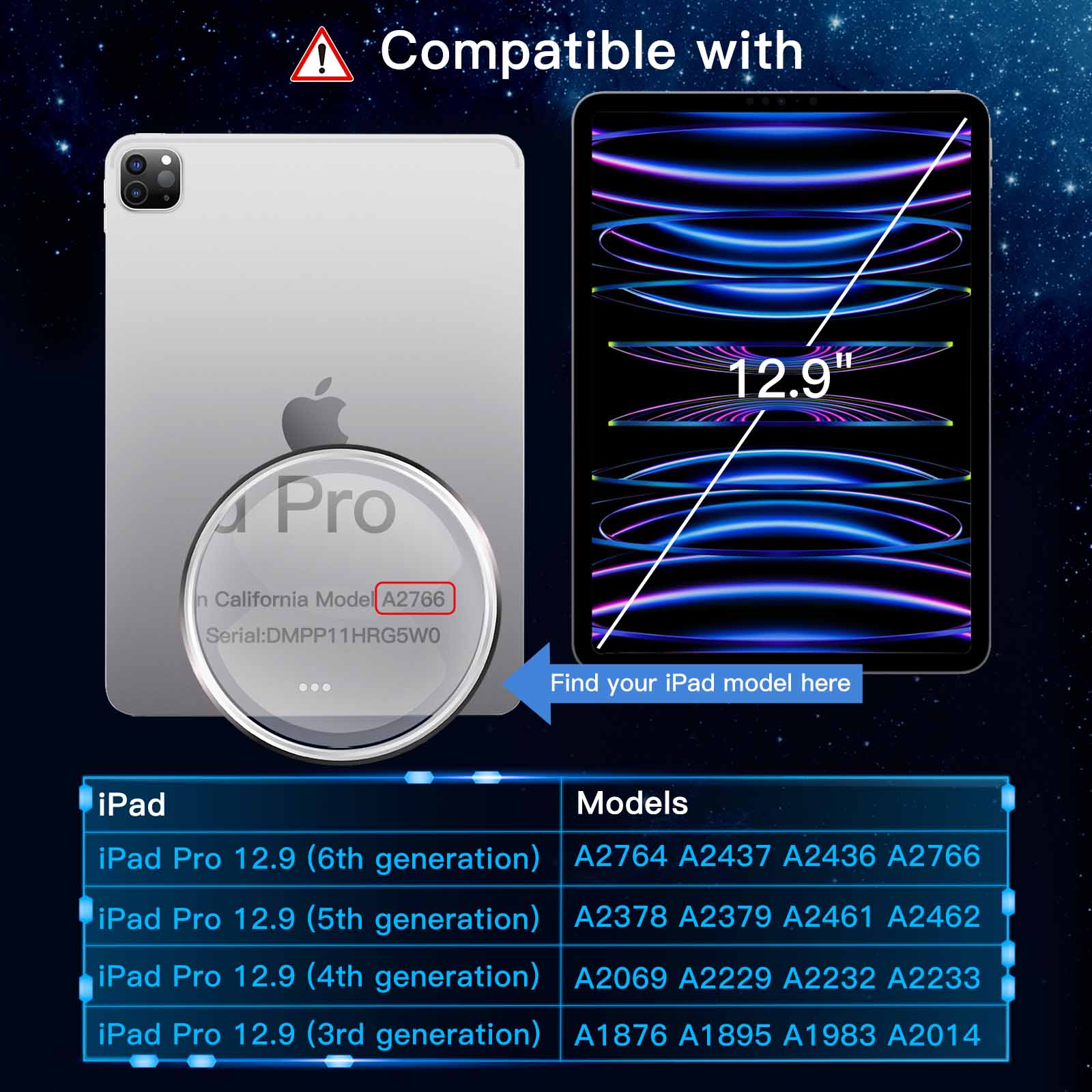 [Compatibility] Exclusively fit iPad Pro 12.9-Inch 2022/2021/2020/2018 (6th/5th/4th/3rd Generation). Fit Models: A2378 / A2379 / A2461 / A2462 / A2069 / A2229 / A2232 / A2233 / A1876 / A1895 / A1983 / A2014 / A2436 / A2764 / A2437 / A2766. Please check back bottom of your iPad to find the model number