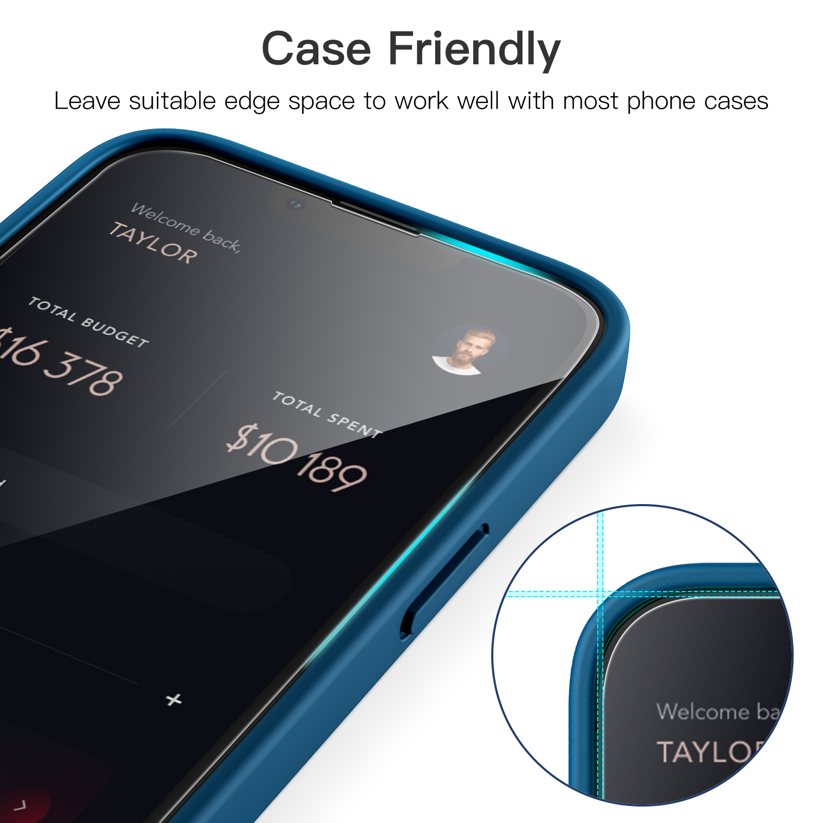 [Case-Friendly] There is enough edge space around the borders for your case to wrap around the edges of your mobile. Compatible with most phone cases