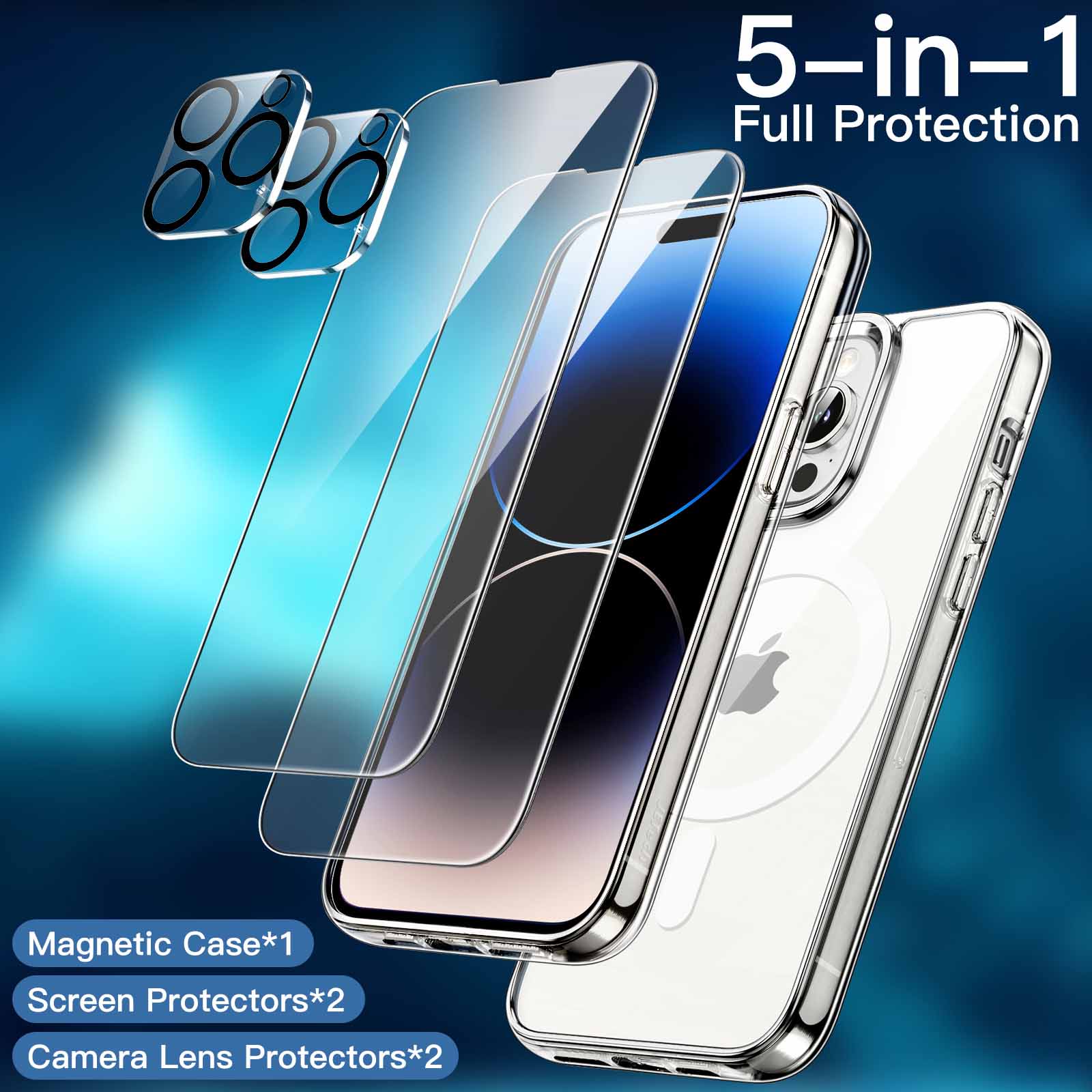 JETech 5 in 1 Magnetic Case for iPhone 14 Pro 6.1-Inch with 2-Pack Tempered Glass Screen Protector and Camera Lens Protector, Compatible with MagSafe, Shockproof Bumper Phone Cover