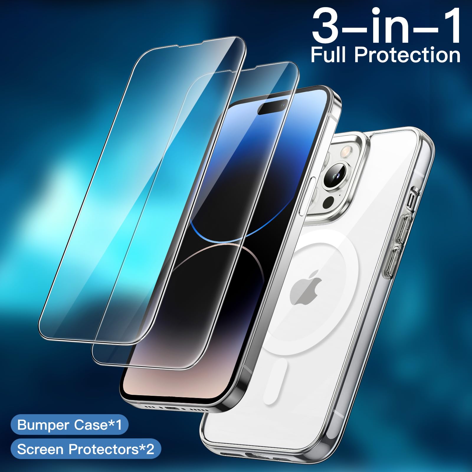 • [3-in-1 High Protection] Exclusively designed for iPhone 14 Pro 6.1-inch. This magnetic case with 2 pack tempered glass screen protectors provides all-around protection for your phone