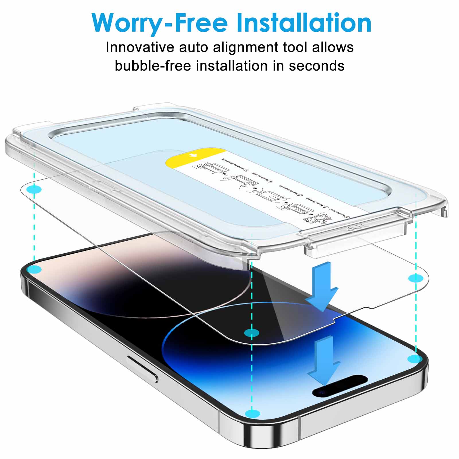 • Note: Remove the two tabs film if it remains on the screen protector. [One Touch Installation] Designed for iPhone 14 Pro 6.1-inch. The innovative alignment tool with screen protector preset makes it super easy and quick to install and no bubbles left