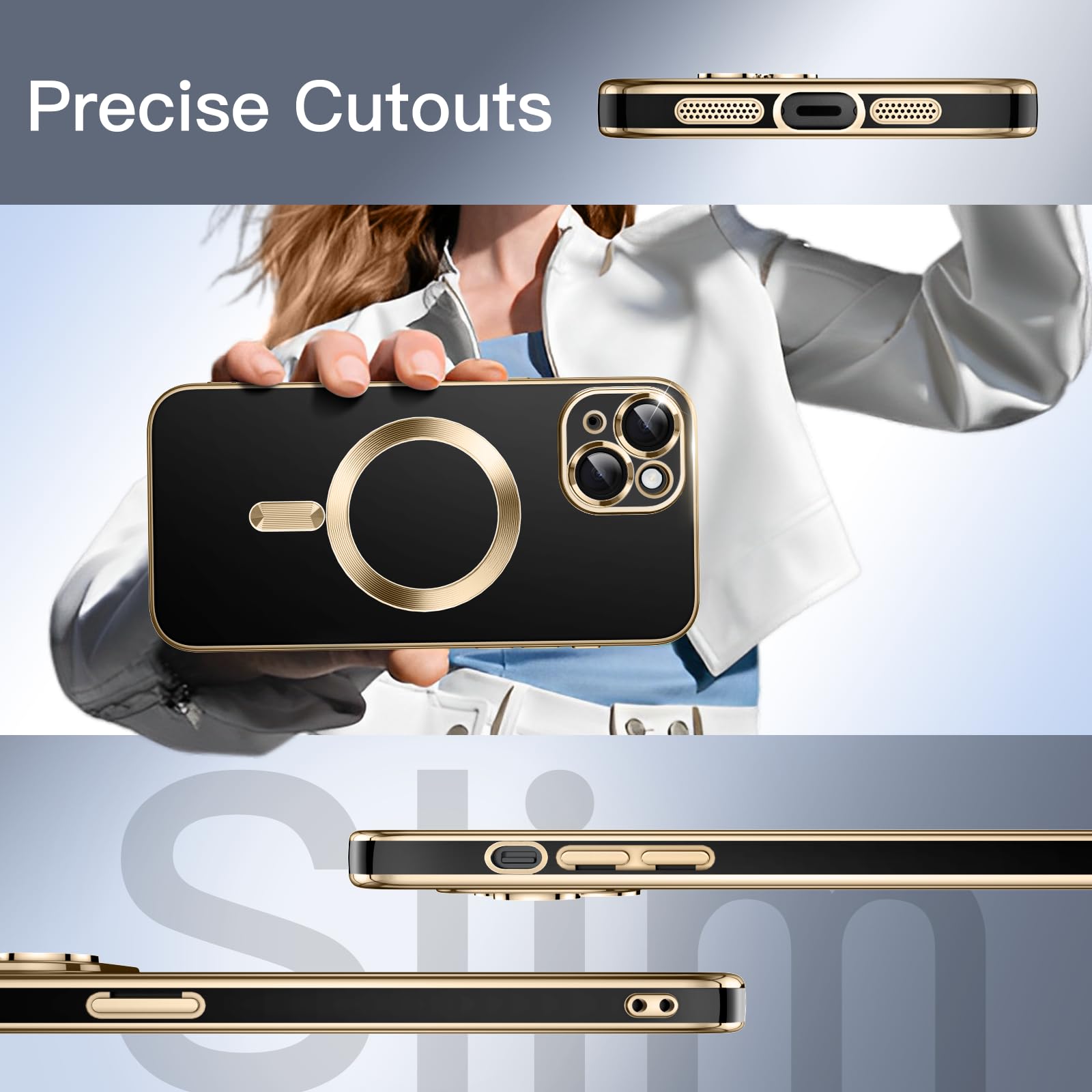 This is pretty striking with the shiny black and the gold. I have a pink iPhone 15 but under this “tux” no one will know! The camera “background” is also black with the gold around the 2 cameras. It is a lightweight TPU cover was easy enough to put on the phone. the cut outs were perfect. I use plug in w/a cord to charge in the house but my car has a spot where you drop your phone in for wireless charging. both work equally well. Please forgive my pix taking skills. you will see reflections in my pix. they are not anything that is “on” the case. it is just my skills or lack there of. I would suggest if you want some understated evening wear for your phone that this might be perfect! 😉