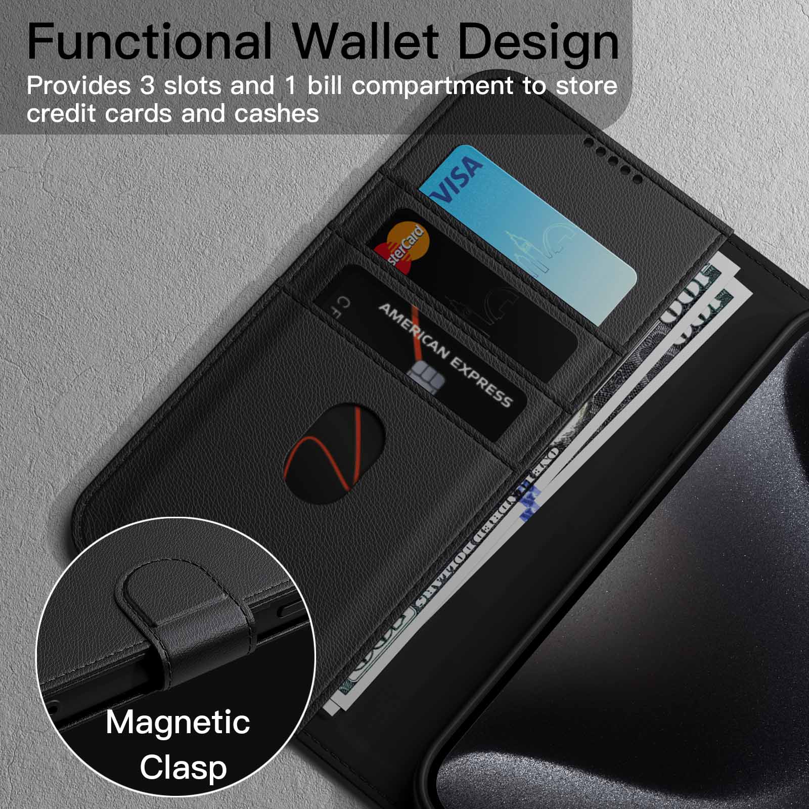 • [Keep Security] The stronger magnetic clasp holds your phone and cards in a closed position. No need to worry the cards and money will fall off. Keep your belongings secure