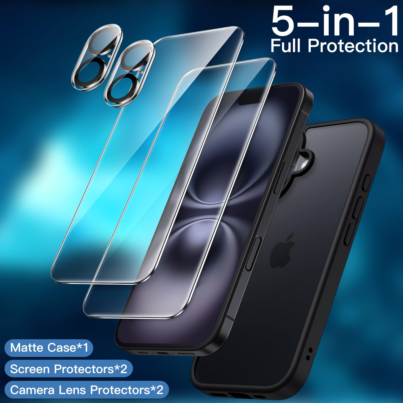 • [5-in-1 Full Protection] There are 2 pack screen protectors with an alignment tool, 2 pack camera lens protectors and a matte case, providing all-around protection for your phone. Easy installation with included accessory kits