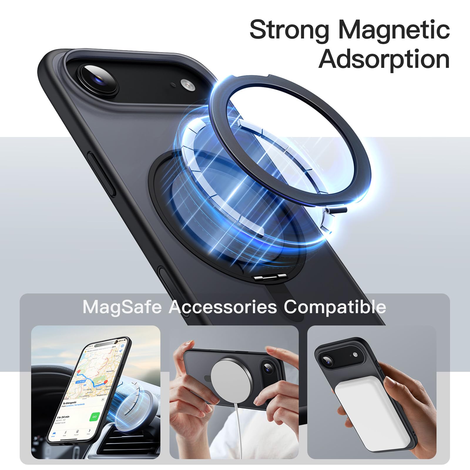 [Super Magnetic Adsorption] Strongly attach to the charger magnetically. Once snap on, never sliding. Compatible with MagSafe accessories, such as wallet, ring holder and power bank. Moreover, we combined the strong magnetic technology with a foldable kickstand, turning it into a hidden magnetic stand that folds back into the groove when not in use