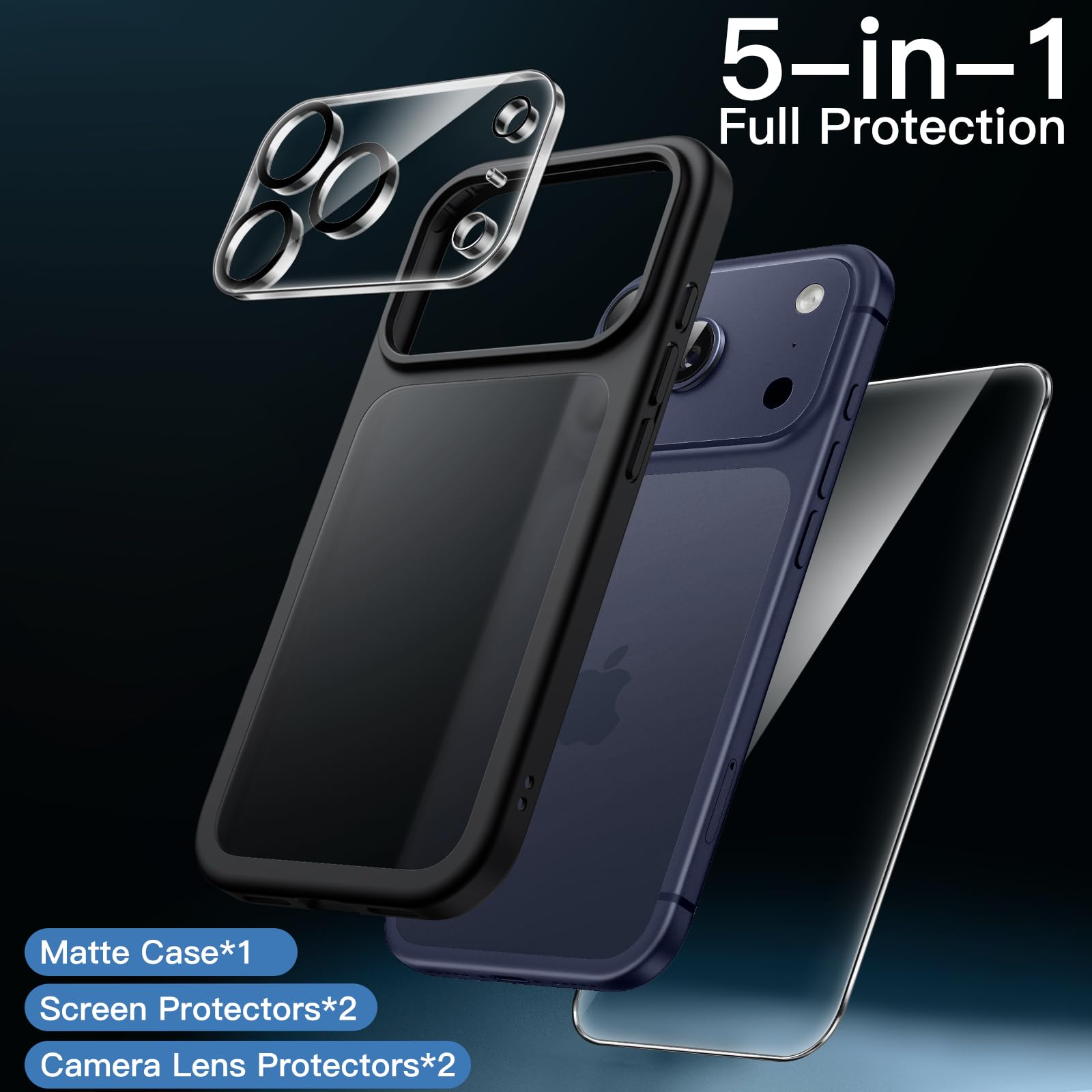 • [5-in-1 Full Protection] There are 2 pack screen protectors with an alignment tool, 2 pack camera lens protectors and a matte case, providing all-around protection for your phone. Easy installation with included accessory kits